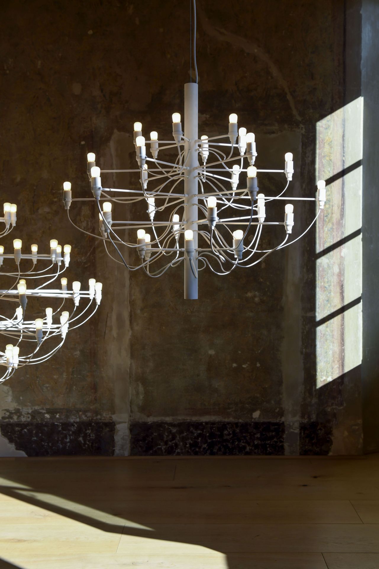 Einem klassischen Kronleuchter nachempfunden ist die 2097 Kronleuchter von Flos eine moderne Version der beliebten Klassiker. Sie sorgt für ein diffuses Licht und erzeugt mit ihren Eisen- und Messing-Armen einen Industrie-Charme.