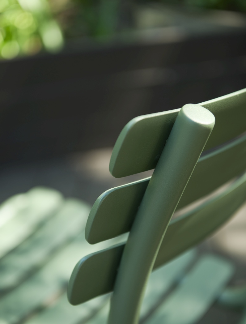 Der Alua Stuhl Outdoor ist gefertigt aus pulverbeschichtetem Aluminium mit den Maßen H 82 cm x B 54 cm x T 59 cm und einer Sitzhöhe von 46,5 cm.