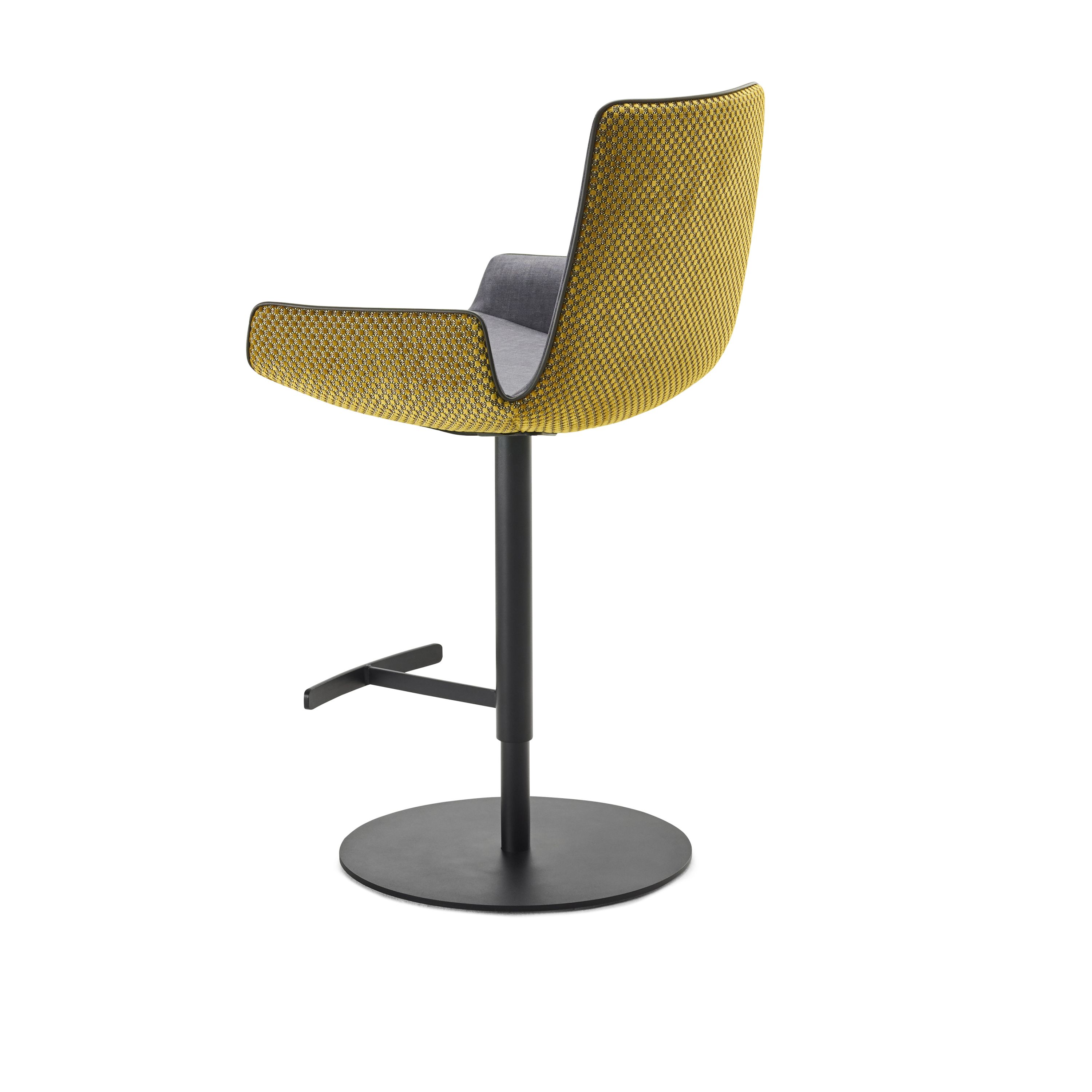 Beim Gestell haben Sie die Auswahl zwischen einem Drahtgestell oder einem dreh- und höhenverstellbaren Säulenfuß. Bei letzterem kann mittels Gasdruckfeder die Sitzhöhe zwischen 63 und 87 cm eingestellt werden. Diese bestehen aus puderbeschichtetem Metall. Wahlweise können Filz- oder Kunststoffgleiter gewählt werden.