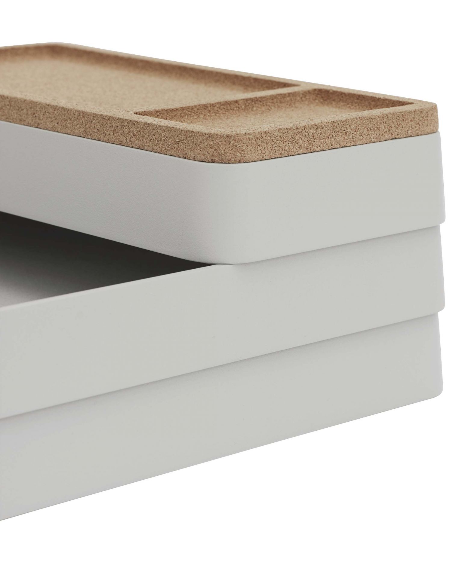 Die Schalen des Arrange Systems bestehen aus 100% recyceltem Kunststoff, der aus Post-Consumer-Polypropylen hergestellt wird. Zudem sind Deckel aus Kork oder eloxiertem Aluminium verfügbar. Die Konfiguration 1 besteht aus drei Teilen, die in zusammengesetzten Zustand folgende Gesamtmaße haben: B 25 x T 32 x H 11 cm.