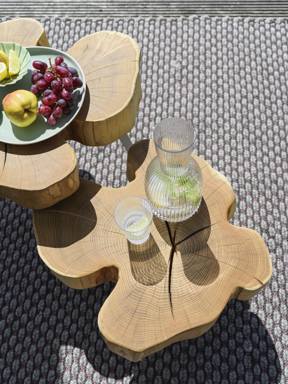 Beim BC 05 Stomp Outdoor ruht eine gebürstete, massive Scheibe eines Akazienstamms auf einem filigranen, schwarz pulverbeschichteten Metallgestell.