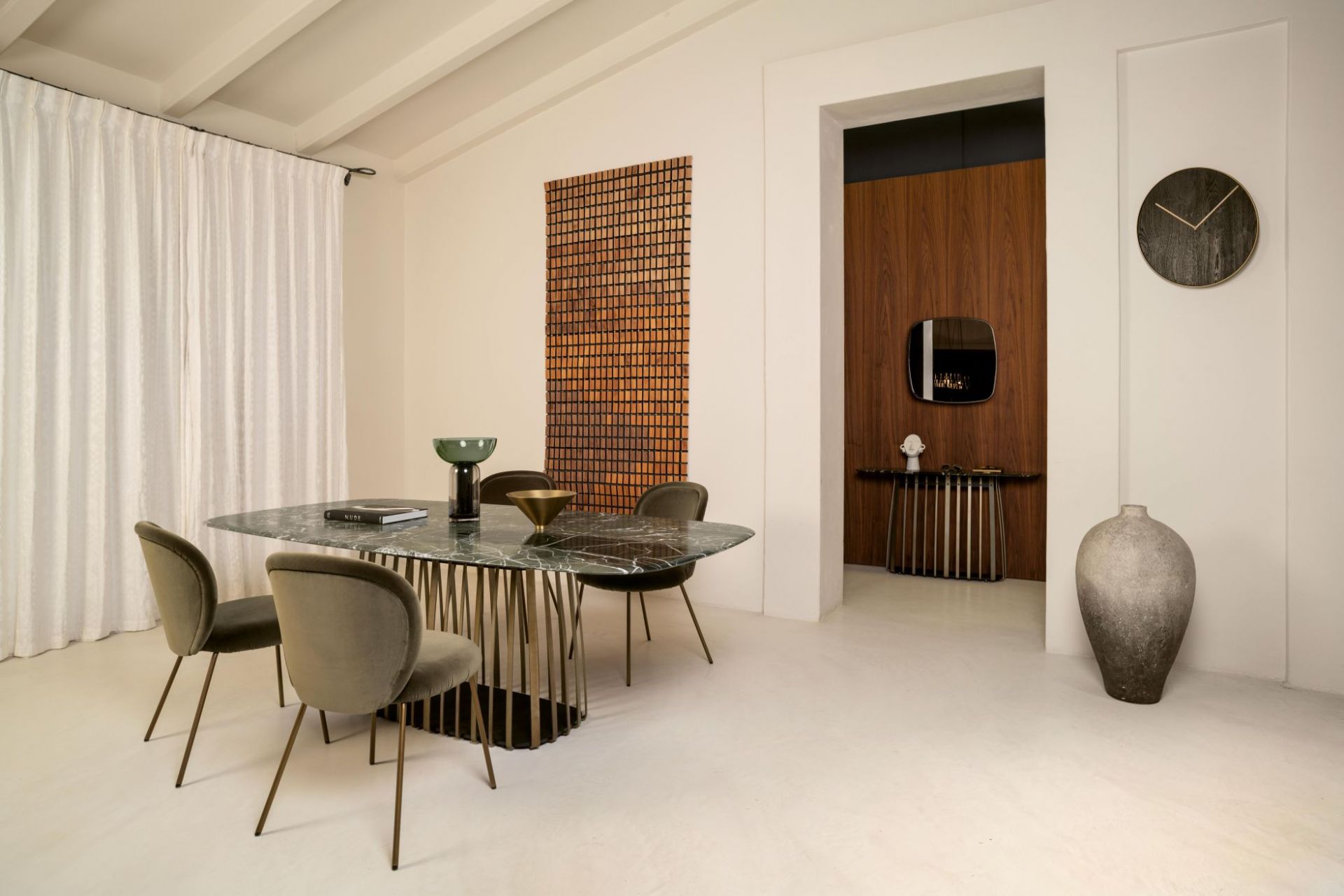 Die Tischplatte ist aus Verde Lepanto Marmor gefertigt. Das elegante Gestell – mit seiner markanten Korbform namensgebend für das Tischdesign – ist aus eloxiertem, messingfarbenem Aluminium gefertigt.