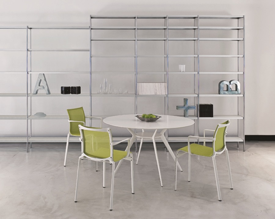 Alberto Meda hat dort, wo die Tischbeine aus wetterfest lackiertem Aluminium zusammenlaufen, ein Tablar angebracht, das den Look des Tischs abrundet und als praktische Ablage dient.