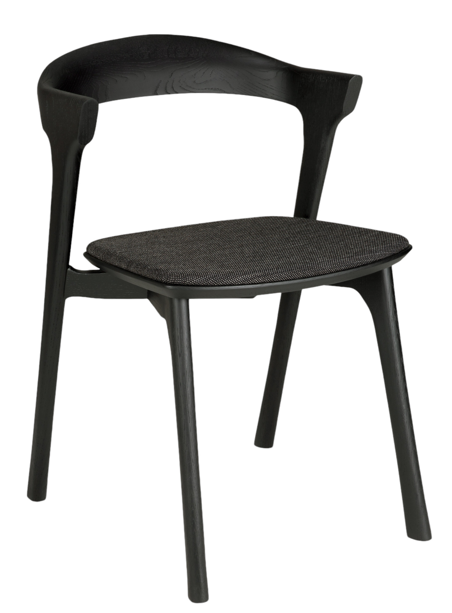 Der Bok Stuhl aus dunkel lackiertem Eichenmassivholz ist 50 cm breit, 54 cm tief und 76 cm hoch. Die Sitzhöhe beträgt 46 cm. Das Textilkissen ist schwarz.