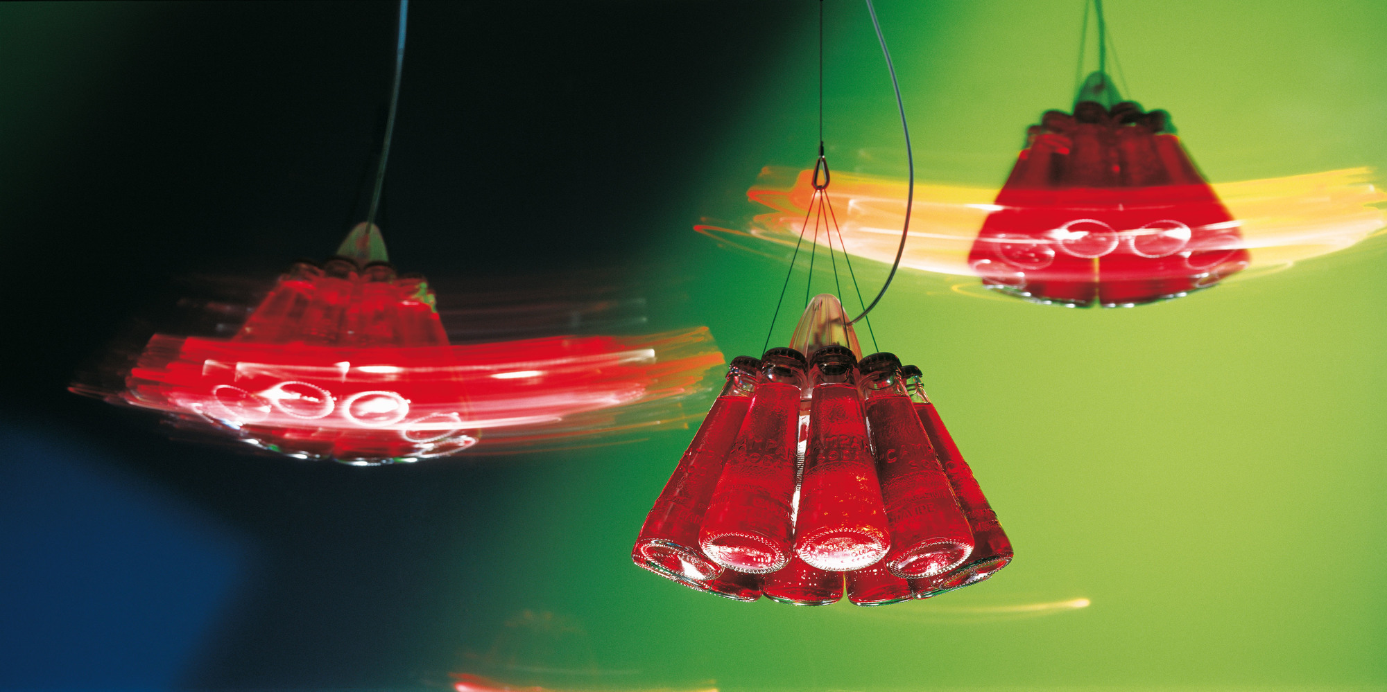 Zehn einzeln abnehmbare originale Campari-Soda-Flaschen bilden den Schirm der Leuchte. Das ist Wiederverwertung neu gedacht. Durch die Campari Kronkorken ist die Leuchte sogar höhenverstellbar.