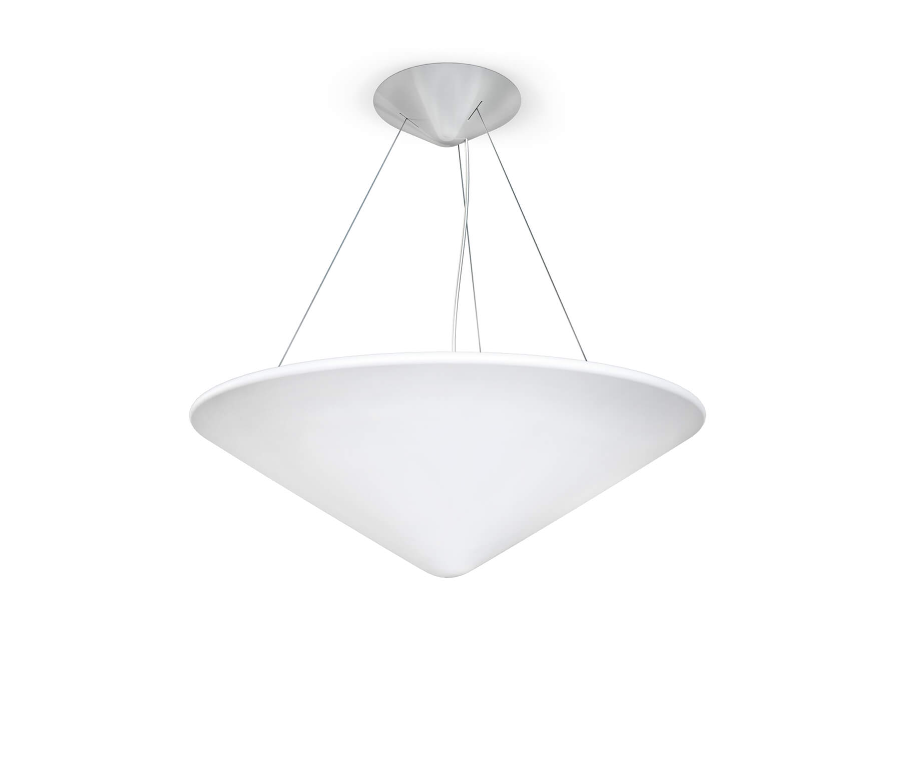 Ein transluzenter Schirm, der schräg gehängt wie ein Ufo im Raum schwebt („peak down“). Diese Leuchte ist stufenlos höhen- und neigungsverstellbar. Außerdem gibt es Varianten für Wand und Decke.