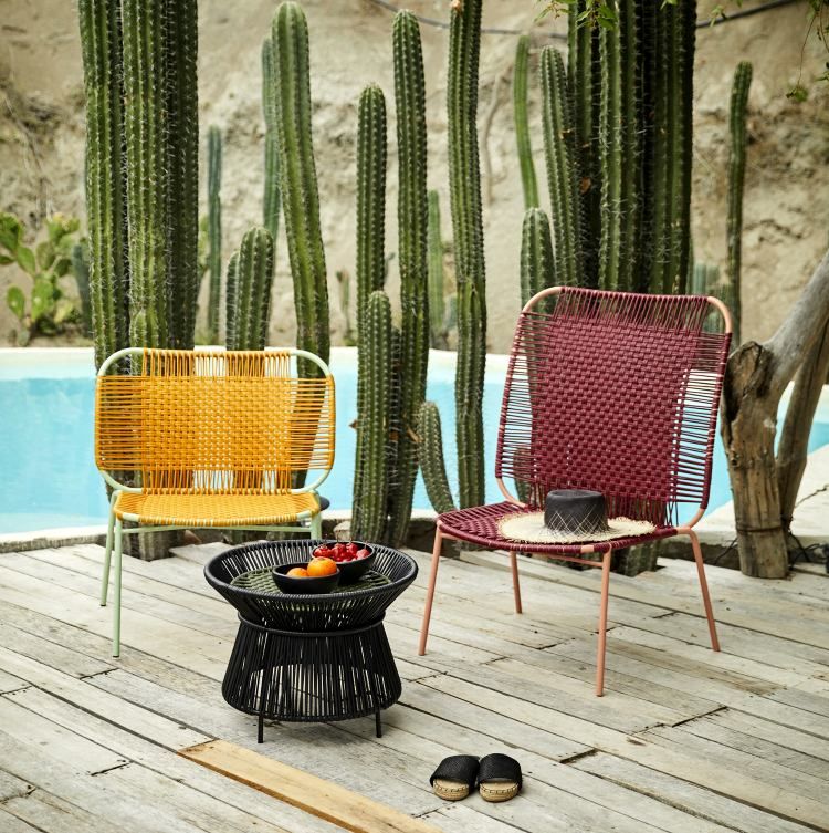 Leicht, gemütlich und bunt – der Cielo Lounge Chair von ames ist sowohl im Innen- als auch im Außenbereich ein farbenfroher Hingucker. Er wurde von Sebastian Herkner entworfen, der sich bei der Farbwahl von der bunten Lebendigkeit Kolumbiens inspirieren ließ. Die Webtechnik, die die kolumbianischen artesanos und artesanas bei der Herstellung der Cielo, Caribe und Cartaganes-Möbelstücke anwenden, heißt "momposino". Diese Methode ist besonders in der Region Santa Marta an der Karibikküste beliebt. Die farbigen Schnüre bestehen aus recyceltem PVC und werden von Hand um einen Rahmen aus feuerverzinktem Stahl geflochten, wodurch verschiedene Muster entstehen.