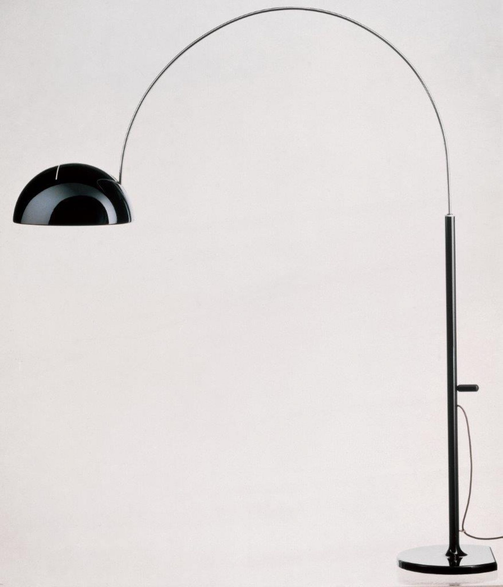 Hat den Bogen raus: die Coupé Stehleuchte von Oluce. Gestaltet wurde Coupé von Joe Colombo, welcher mit dem italienischen Leuchtenhersteller Oluce untrennbar vereint ist. Diese Lampe ist eine Neuauflage der Orignalleuchte aus dem Jahr 1967.