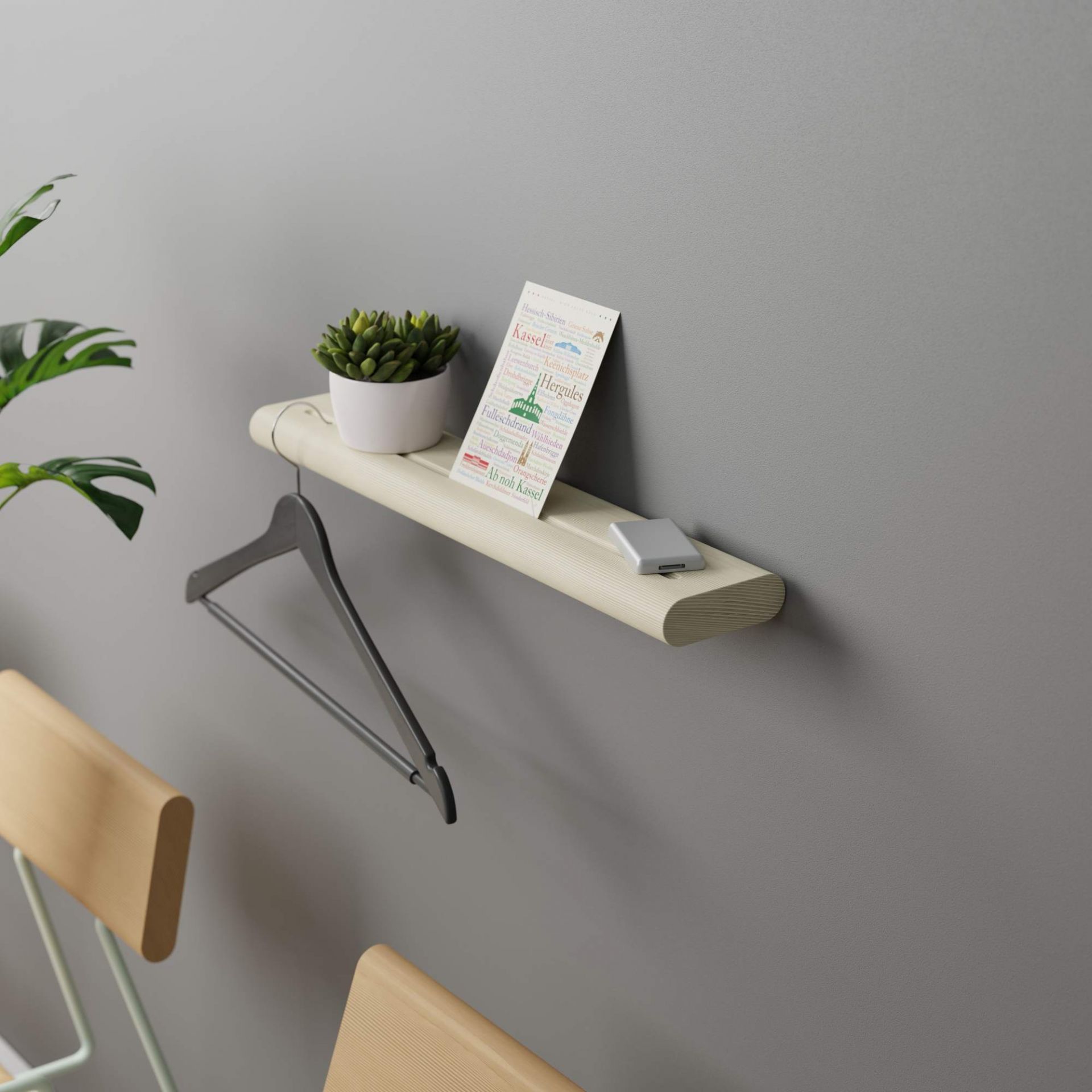 Das Regal besteht aus Eschenholz. Es ist 3 cm hoch, 50 cm breit und 10 cm tief..