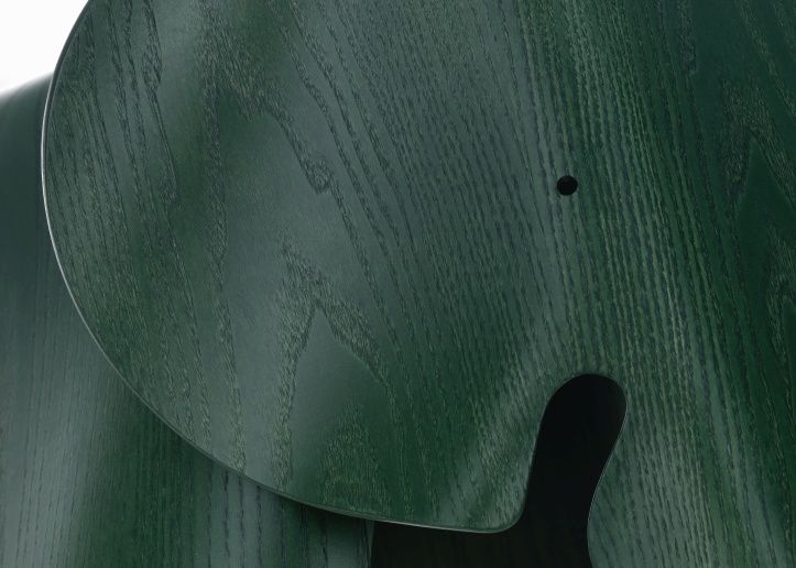Der Elephant besteht aus Formsperrholz mit Deckfurnier in grün gebeiztem Eschenholz. Er ist 41 cm breit, 78,5 cm tief und 41,5 cm hoch.
