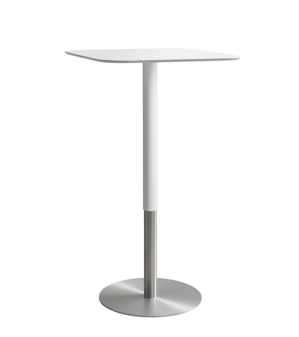 ED besteht aus hochwertigen, pflegeleichten und äußerst kratzfesten Materialien. So wird die Tischplatte aus High Pressure Laminat gefertigt und der Standfuß besteht aus gebürstetem Edelstahl mit einem weiß pulverbeschichteten Mittelteil.
