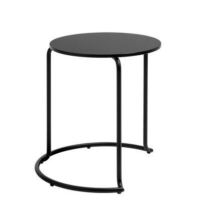 Abgemahnt Beistelltisch von Nils Holger Moormann: Schwarze Tischplatte, Holzfuß und Stahlgestell.