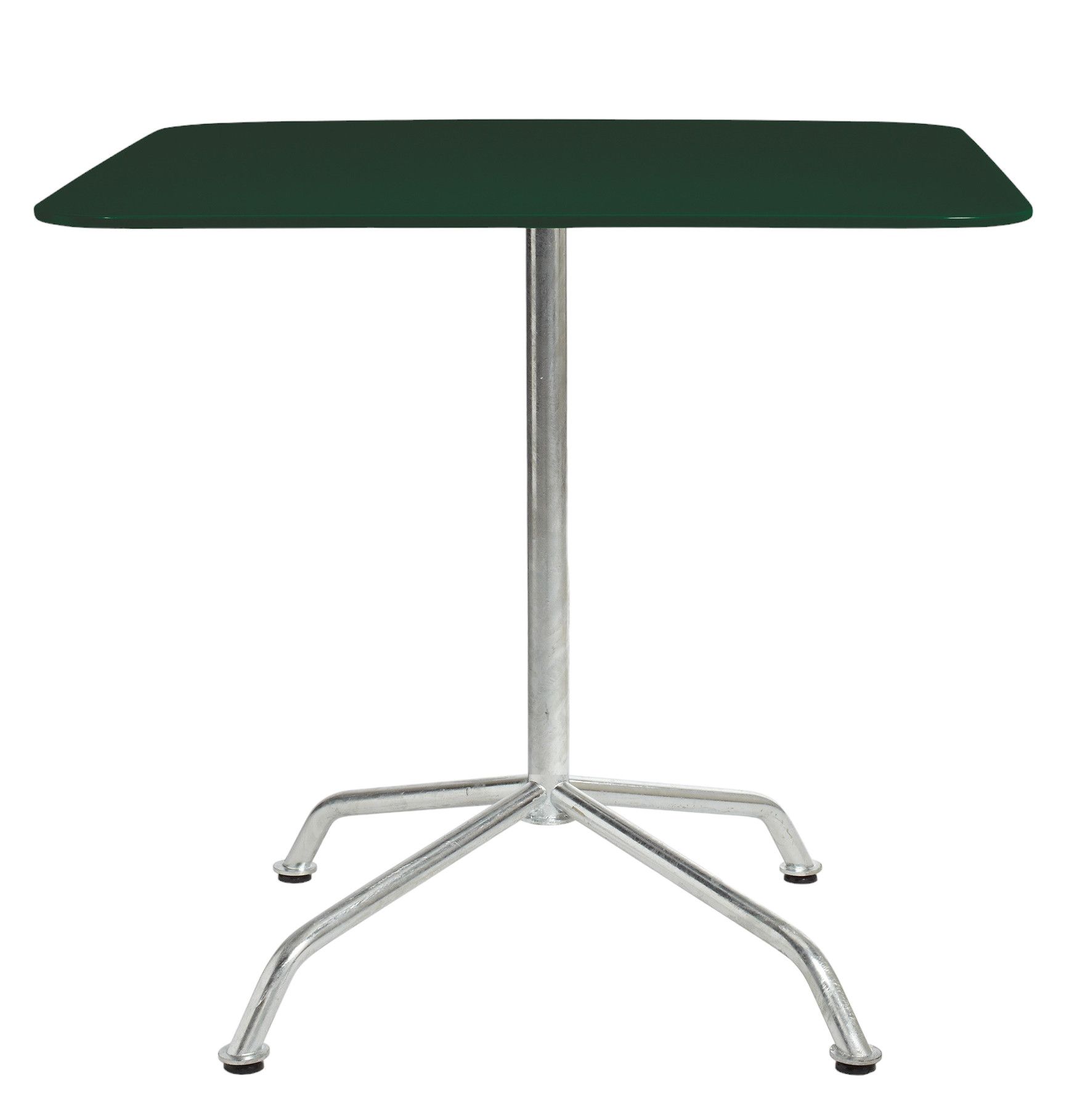 Der Haefeli Tisch ist aus verzinktem Blech in den Maßen B 80 cm x T 80 cm und einer Tischhöhe von 74 cm erhältlich. Außerdem ist er abklappbar.