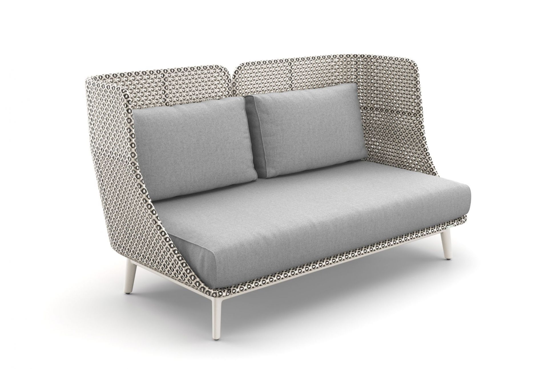 Mbarq Sofa von Dedon mit hoher Rückenlehne und grauen Polstern für den Außenbereich.