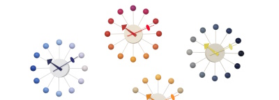 Ball Clock Wanduhr Dusk Vitra LIMITED EDITION mit bunten Kugeln und gelben Zeigern.