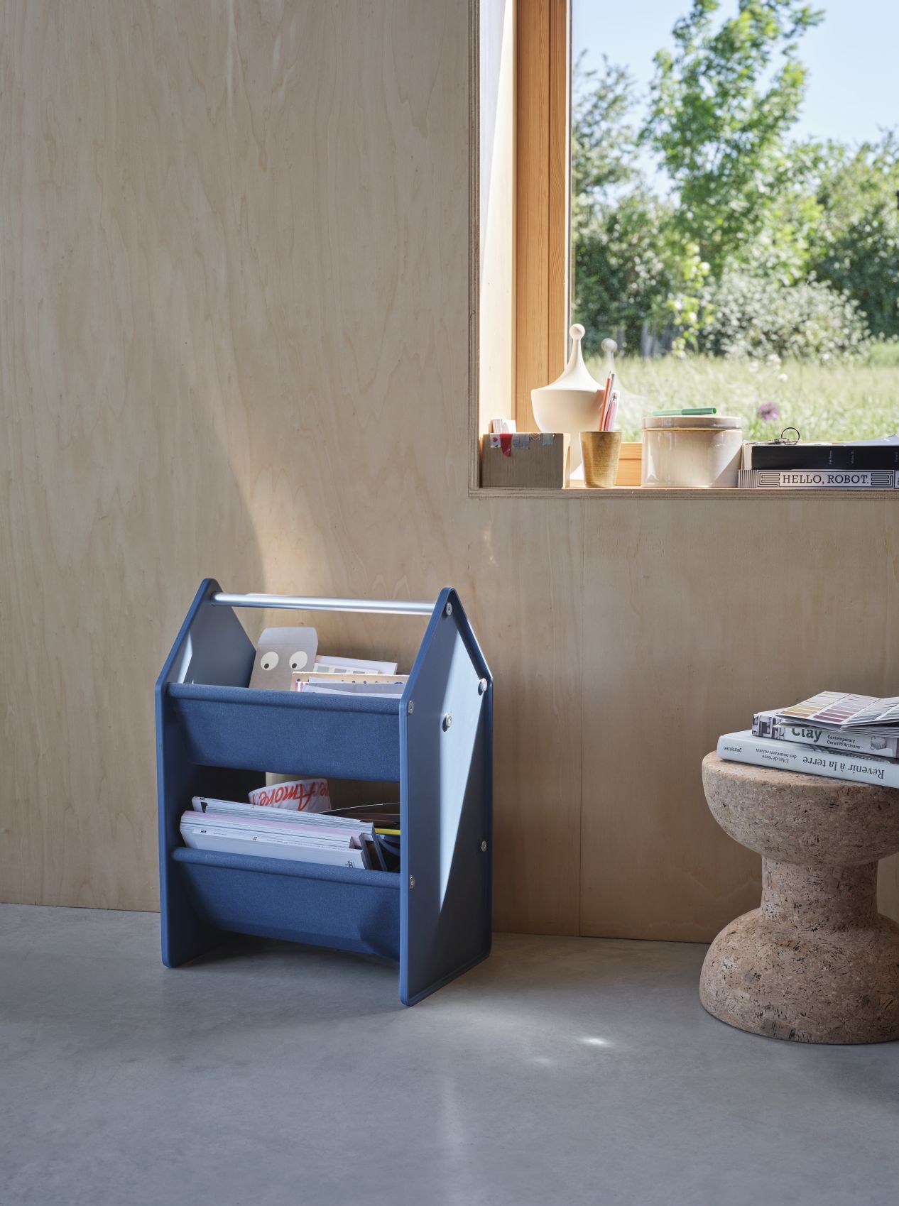 Blauer Panton Junior Stuhl von Vitra im Kinderzimmer mit Spielzeug darauf. Kinderstuhl Design.