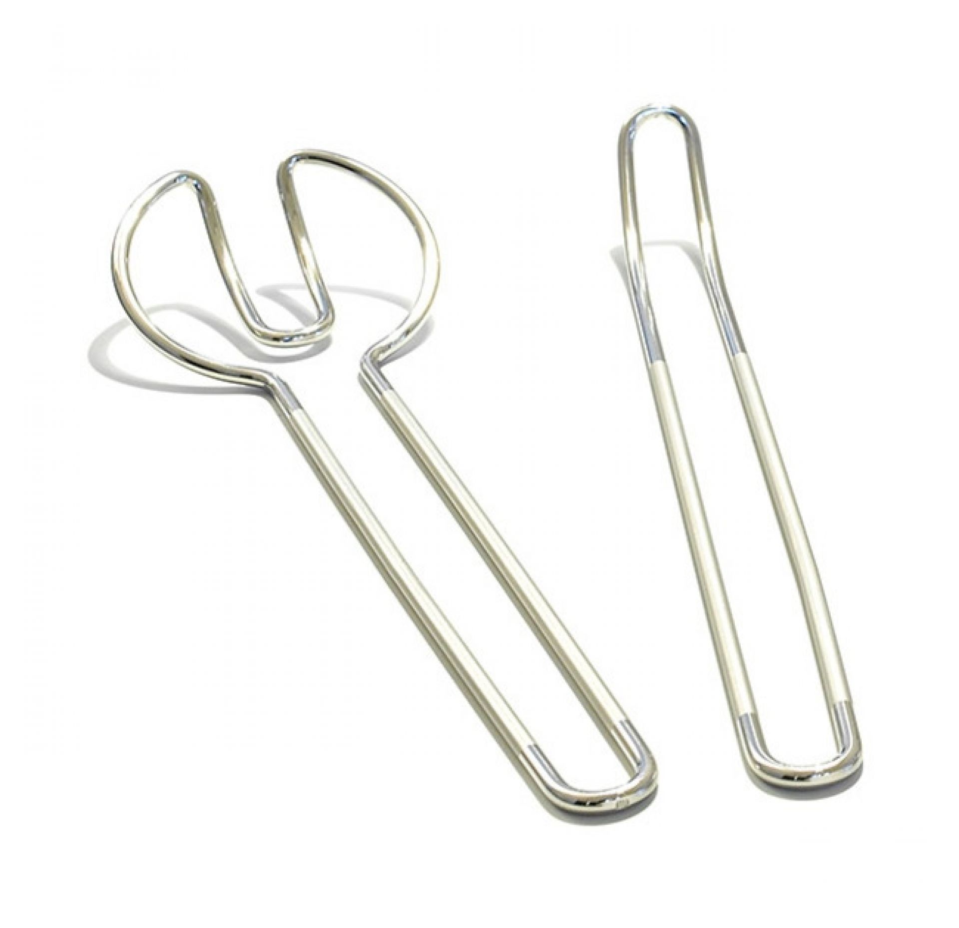 Verformter Edelstahldraht bildet die Grundlage für dieses minimalistische Bauhaus Salatbesteck von Prof. Knud Holscher aus dem Jahr 1975. Es wurde einige Jahre lang in Dänemark hergestellt und befindet sich nun in der Sammlung des New Yorker Museum of Modern Art.