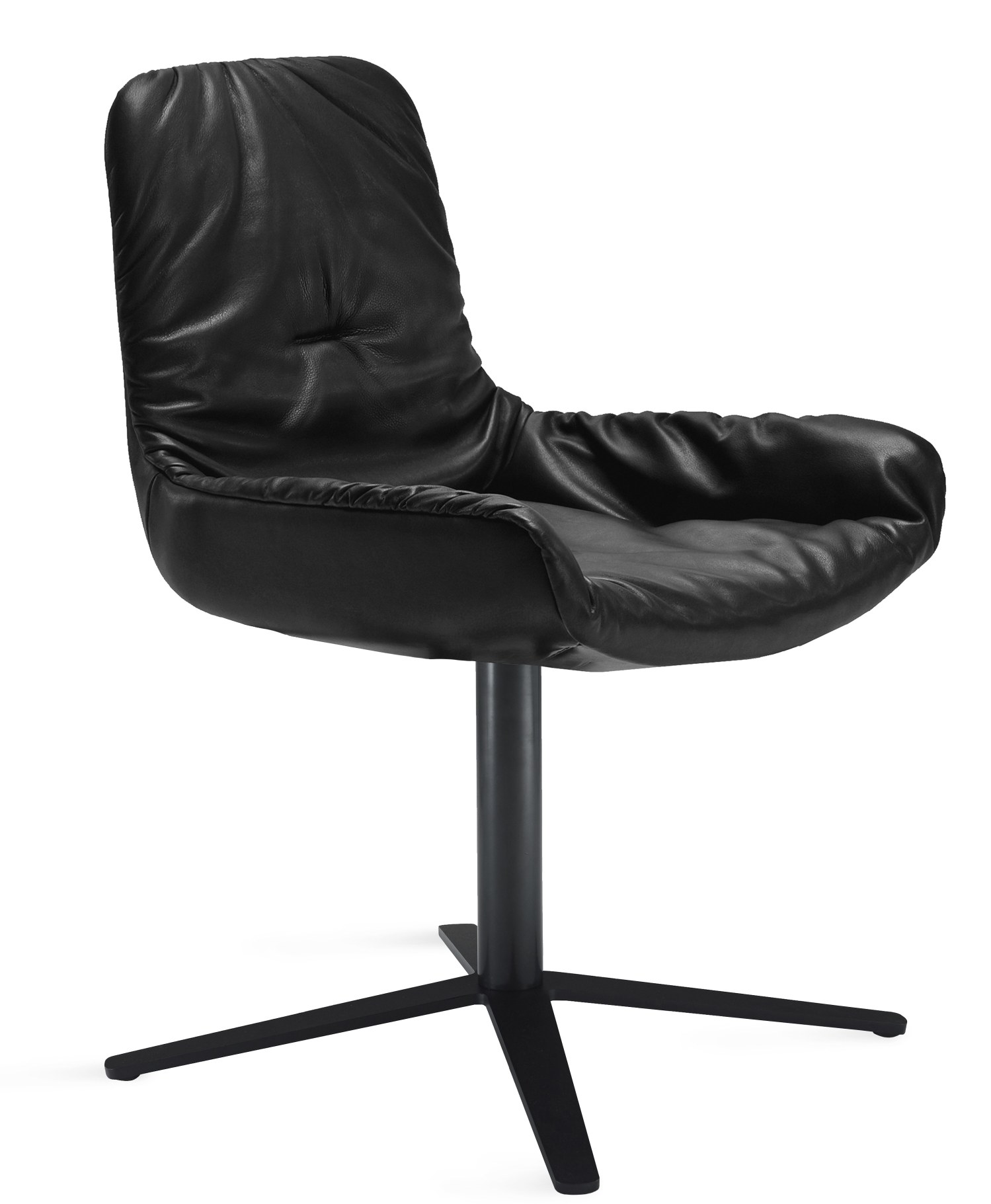 Die Polsterinnenseite des Designstuhls erinnert an einen geschmeidigen Überwurf, der sich beim Sitzen geradezu an den Körper anschmiegt. Die niedrigen Armlehnen verleihen dabei ein festes Sitzgefühl.