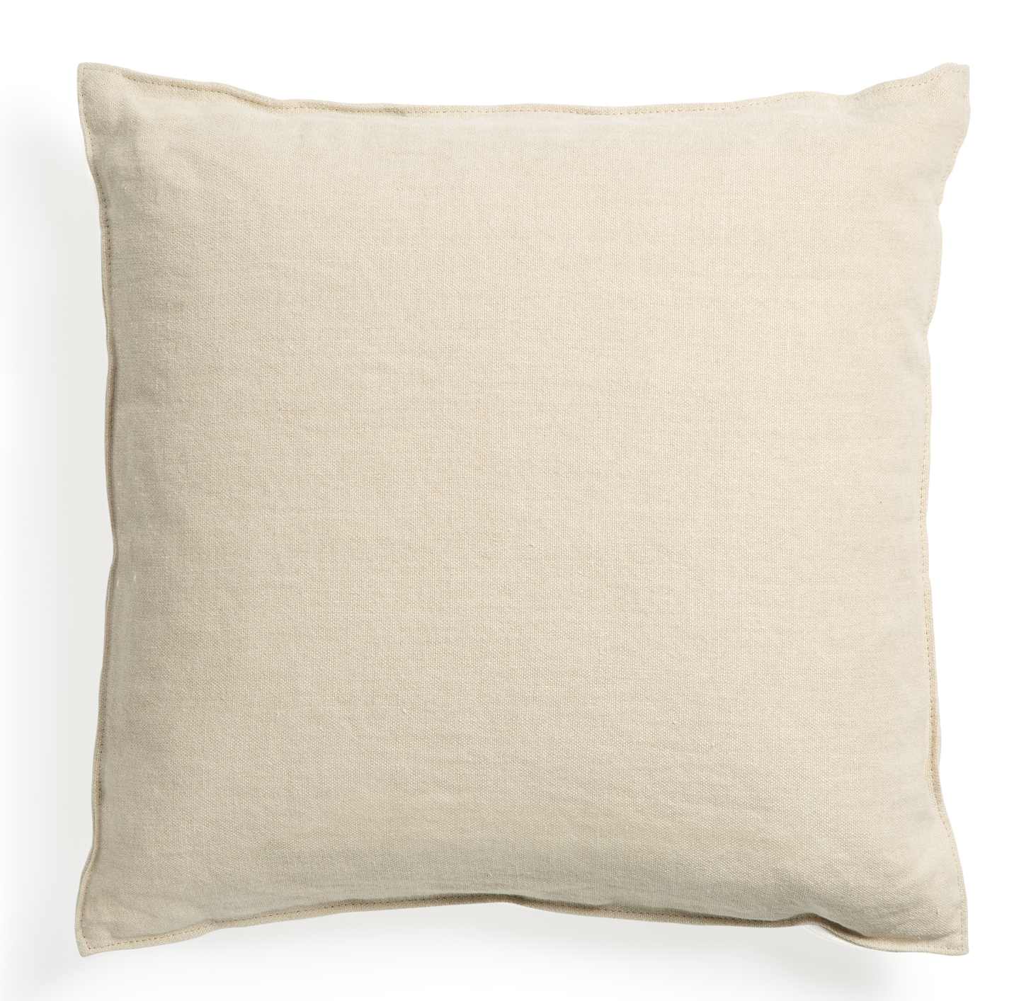 Der Kissenbezug besteht aus 100 % Leinen. Die Baumwoll-Kissenhüllen sind mit 100 % Entendaunen, die zu 50 % aus recycelten Daunen bestehen, gefüllt. Das Kissen ist 50 cm breit, 50 cm tief und 15 cm hoch.