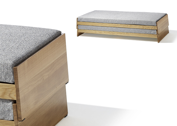 Dieses Bett ist ein Sofa ist ein Bett ist ein Sofa . . . Genau! Lönneberga ist beides – und so wunderschön, elegant und raffiniert konzipiert, dass Sie vermutlich schon bald nicht mehr wissen, ob noch Sie noch auf dem Sofa sitzen oder schon im Bett liegen. Design, Funktionalität und hochwertige Verarbeitung machen dieses Designer-Stapelbett aus massiver Eiche von Richard Lampert zum Lieblingsstück für alle, die Design lieben, aber deren Platz Zuhause beschränkt ist. Ob Sie es sich selbst bequem machen oder Ihren Gästen eine traumhafte Schlafstätte ohne lästige Bettritze bieten wollen – oder zwei Einzelbetten bevorzugen – hier ist eine geniale Idee geboren, ganz so wie bei Astrid Lindgrens Michel aus Lönneberga, nach dem Designer Alexander Seifried das Stapelbett Lönneberga benannt hat. Und auch das Zubehör trägt die Namen aus dem schwedischen Kinderbuchklassiker. Da gibt es das Ablageblech namens Michel, Bettsack Alfred erinnert an den Knecht, der Bettkasten Alma an die Magd und der Rausfallschutz Lina an Michels kleine Schwester. Der Bettkasten Alma bietet viel Stauraum und ist stapelbar. Das Bett ist inklusive Lattenrost, der fest mit dem Bettrahmen verbunden ist.