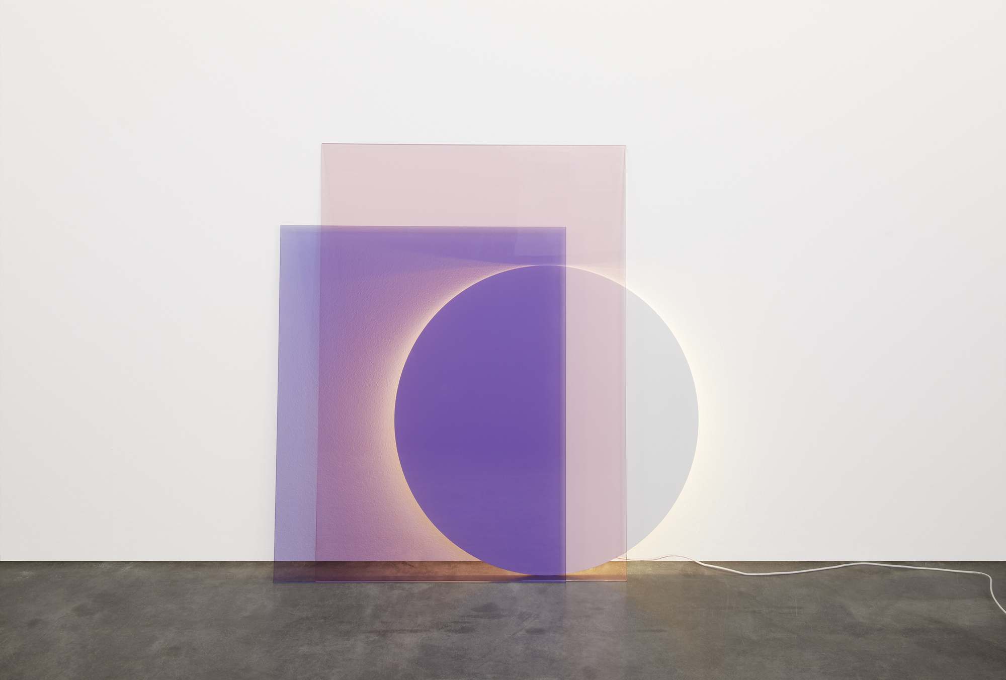 Die von Daniel Rybakken und Andreas Engesvik entworfene Leuchte besteht aus einem signalweißen Leuchtkörper und zwei unterschiedlich hohen Glasscheiben in Rosa und Blau-Violett.