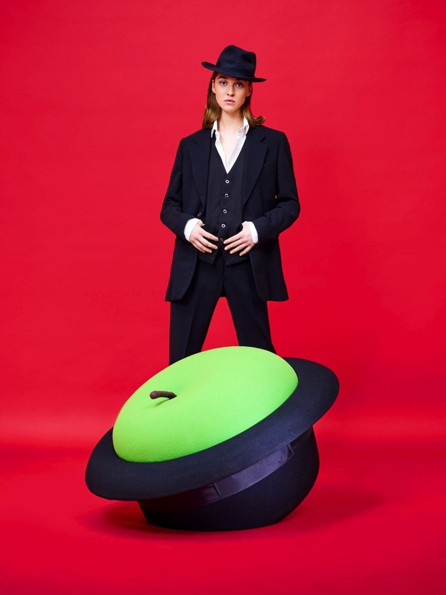 Aus dem Hut gezaubert – Gufram wählt für seinen MagriTTA Pouf jedoch nicht das klassische Kaninchen, sondern einen bunten Apfel! Die schwarze Melone mit dem farbigen Apfel darin sind eine Hommage an den Surrealismus – Designer Sebastián Matta hat wiederkehrende Elemente aus den Werken von René Magritte zu einem ausgefallenen Pouf zusammengestellt.