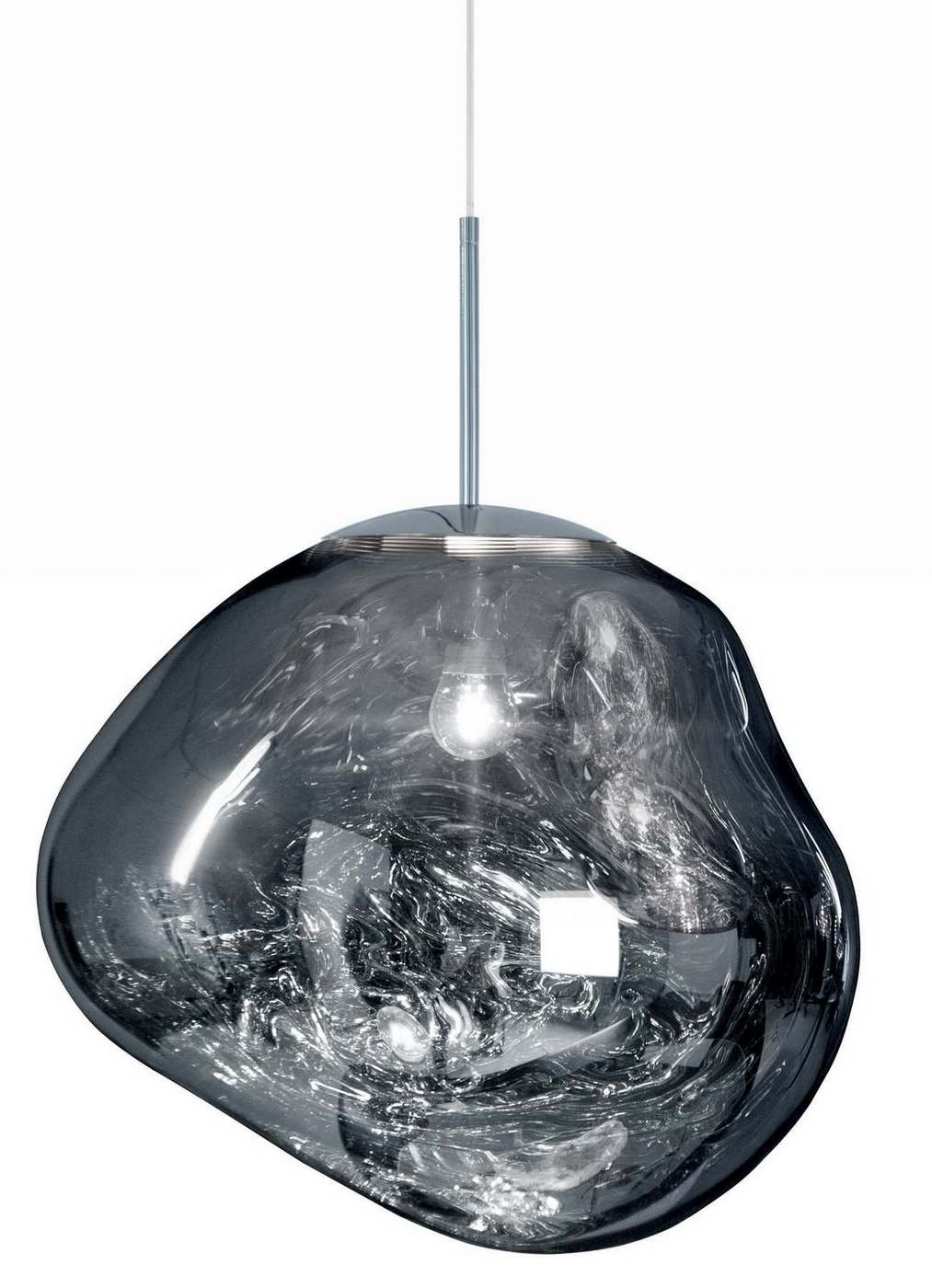 Dann wird ihr teils transparentes, teils metallisiertes Inneres beleuchtet und lässt den Lampenschirm wie flüssiges, mundgeblasenes Glas schimmern. Die unregelmäßige Leuchtenform perfektioniert die Illusion, da sie den schmelzend-fließenden Eindruck unterstützt.