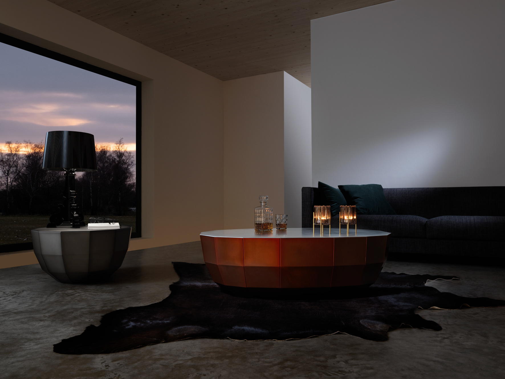 Eine facettenartig verschraubte Unterkonstruktion ist der Hingucker des MO 08 Couchtisches von Müller Möbelfabrikation. Eine Aluminiumplatte bildet die Ablagefläche und einen klaren Kontrast zu dem kunstvollen Gestell.