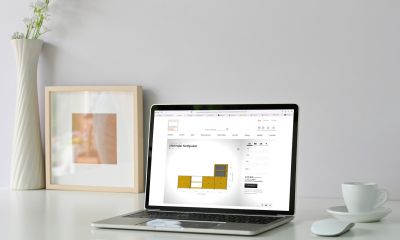 Laptop zeigt USM Haller Tisch Konfigurator für individuelle Büromöbel und Design Tische.