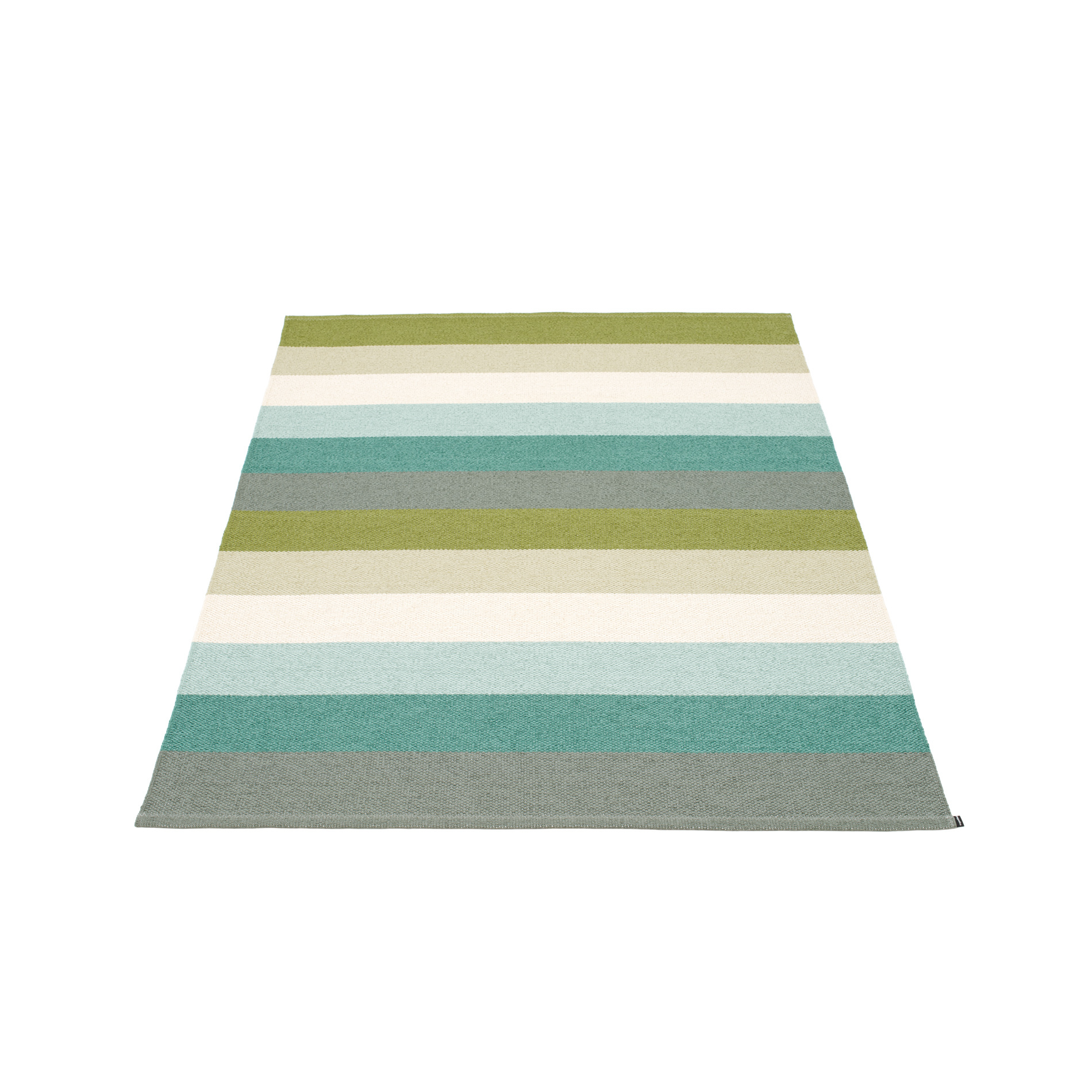 Dicke Blockstreifen machen Molly zu einem besonderen Hingucker, der gekonnt verschiedene Farben kombiniert. Der besonders pflegeleichte Teppich ist aus PVC hergestellt und wird in Schweden von Hand an traditionellen Webstühlen gefertigt.