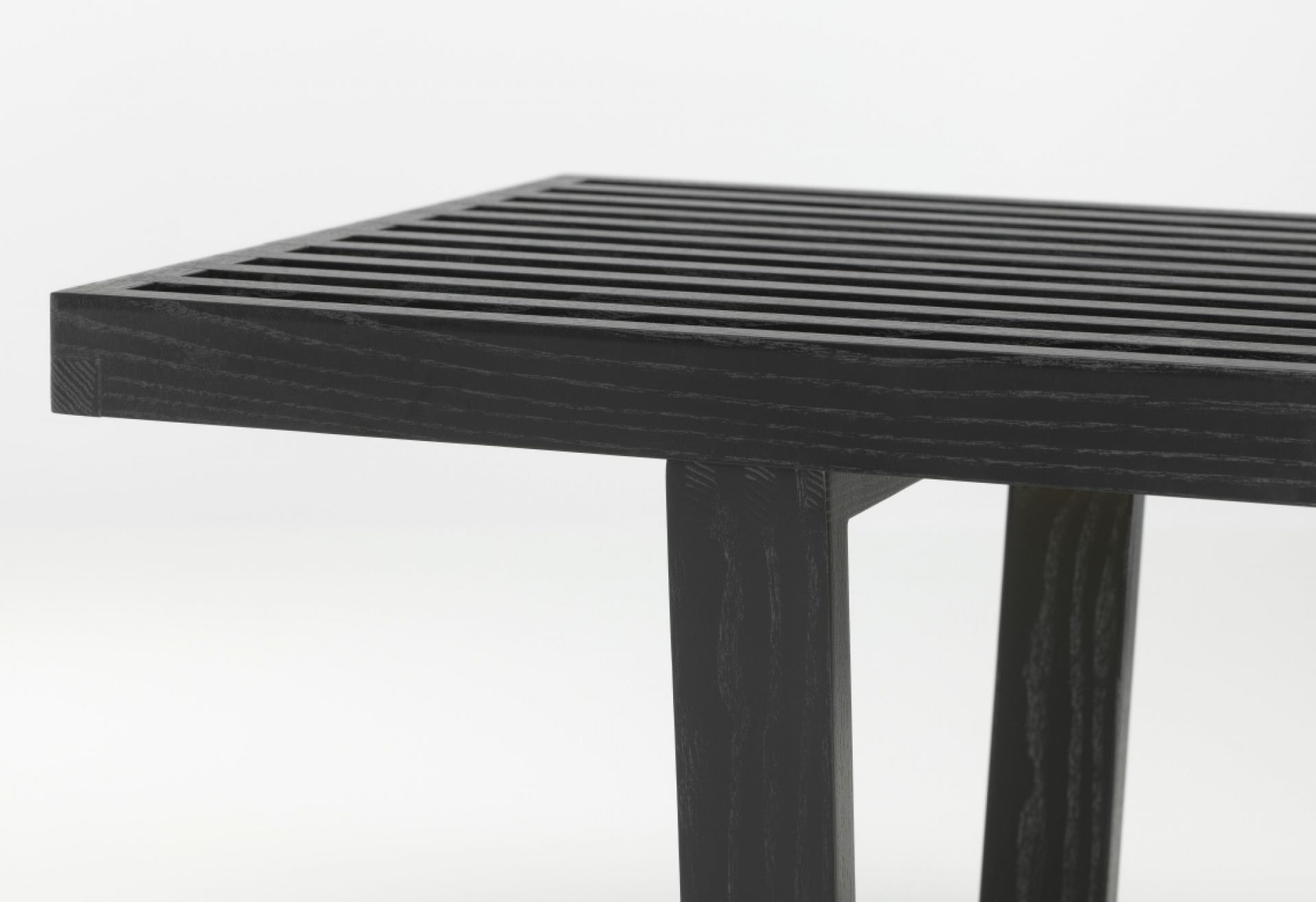 Die Nelson Bank besteht aus einer Sitzfläche aus Eschenholz-Lamellen und einem Untergestell aus schwarz lackiertem Eschenholz. Das Holz stammt aus Westeuropa und/oder Polen. Die Bank ist in zwei Größen erhältlich.