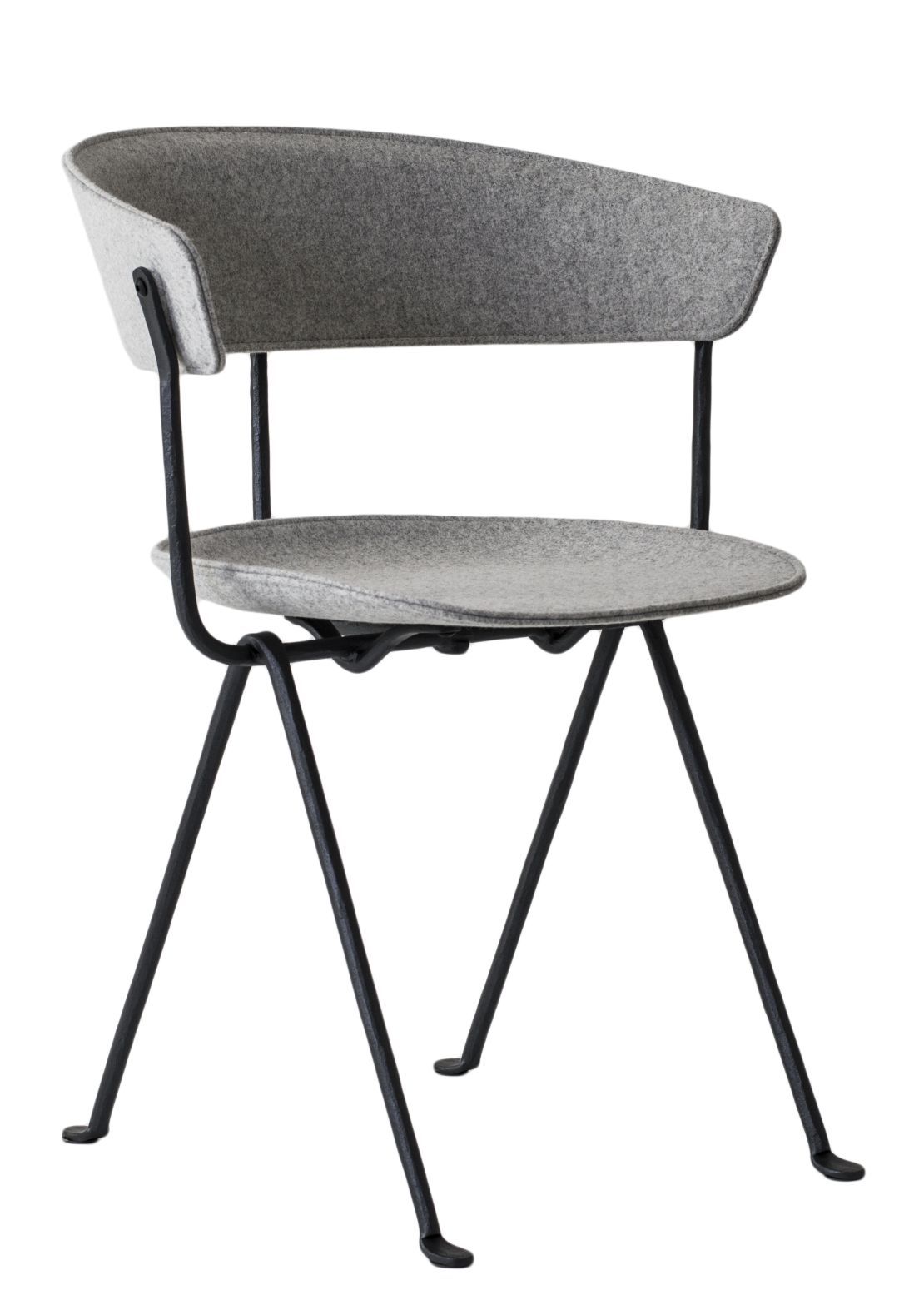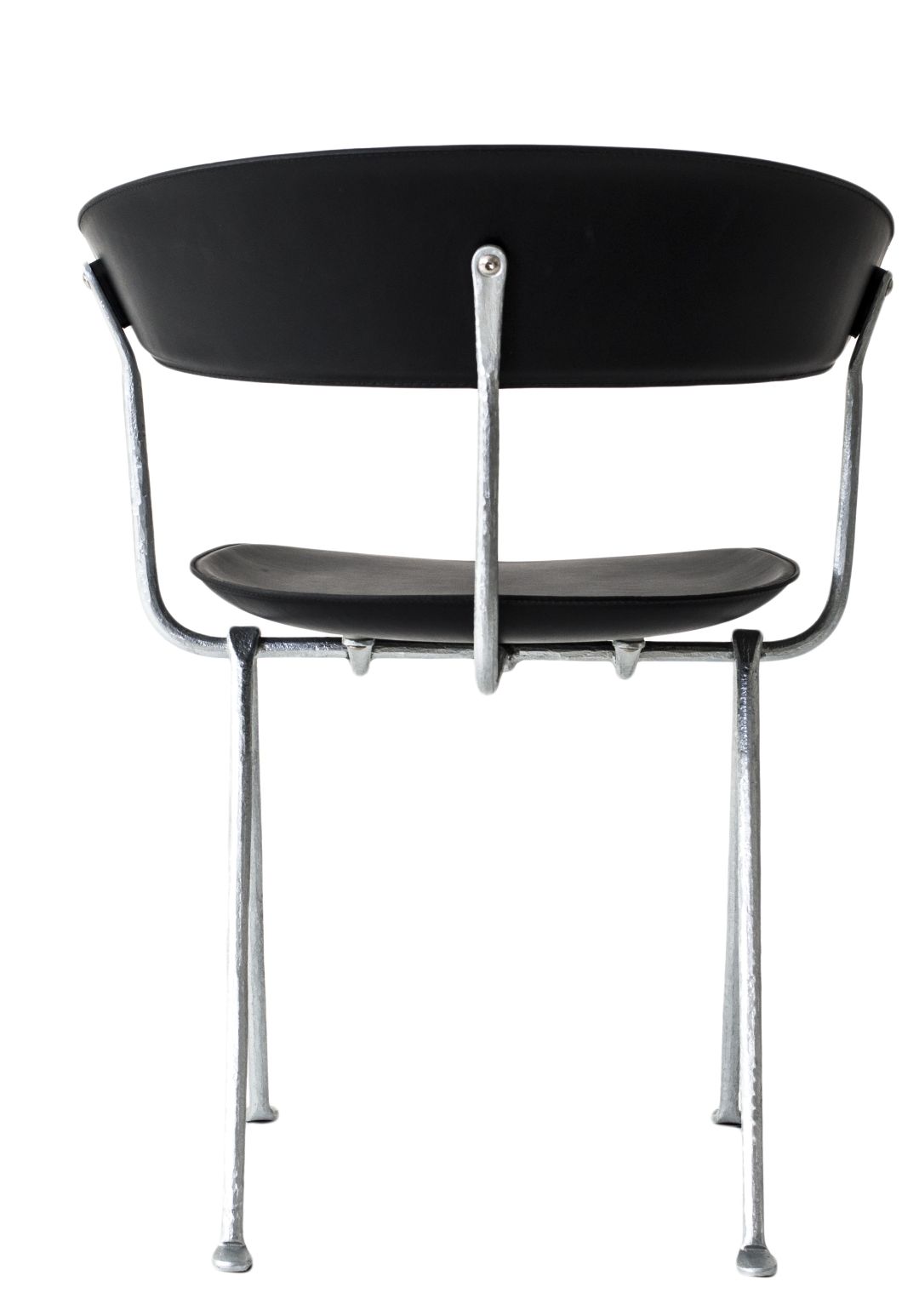 Der Officina-Stuhl von Magis ist eine Melange aus fein gegerbtem Leder, Schurwolle und Schmiedekunst, es gibt ihn den Farben Schwarz, Dunkelgrün oder Grau Metallic, jeweils kombinierbar verzinkt oder anthrazitfarben. Er ist 58 cm breit, 54 cm tief, 80 cm hoch, die Sitzhöhe beträgt 46 cm, die Tiefe der Rückenlehne 33 cm. Der Design-Stuhl wiegt 8,8 kg und ist outdoorgeeignet.