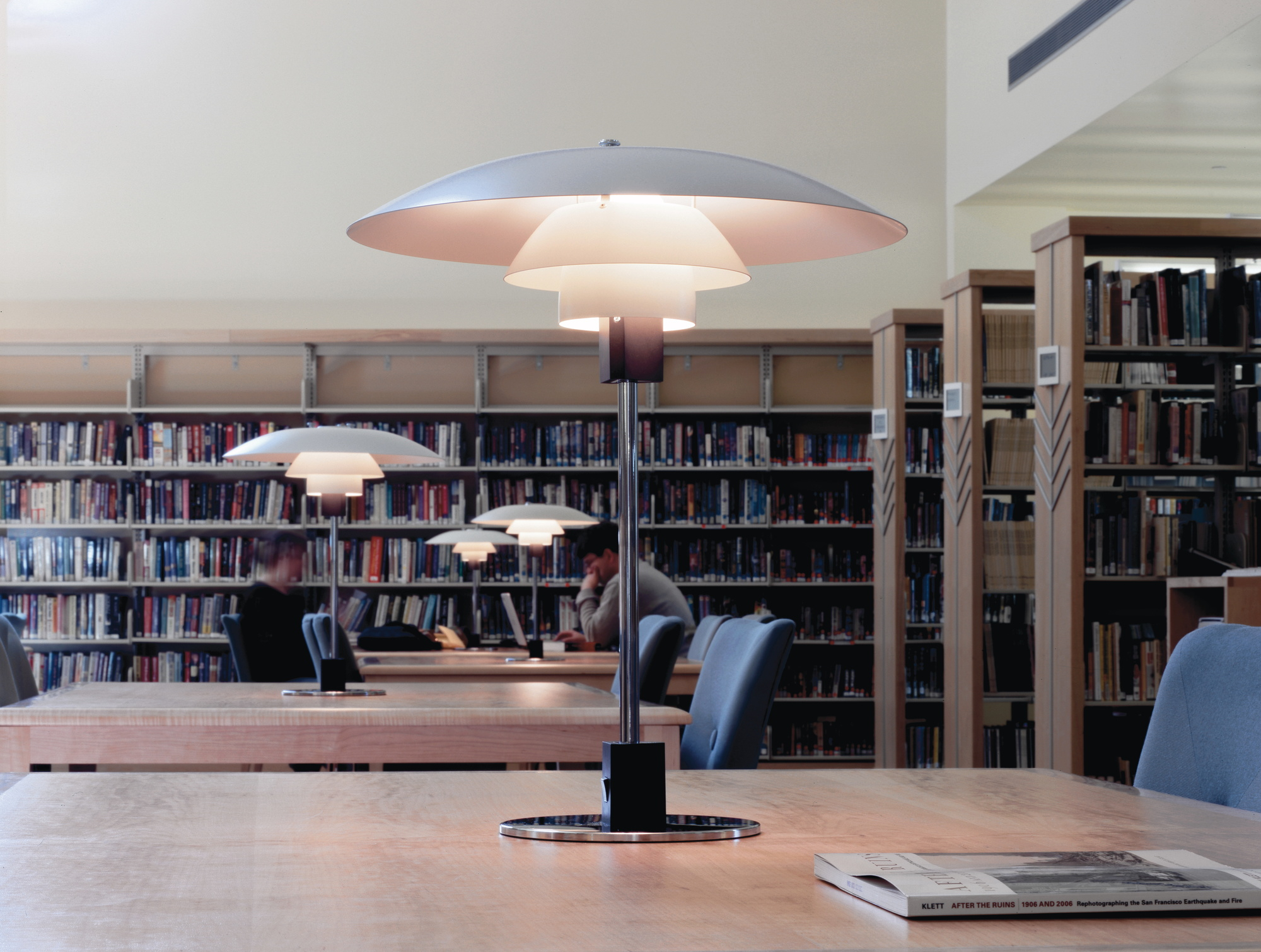 Das Modell PH 4/3 Tischleuchte gehört zur 30 Modelle umfassenden Serie mit dreiteiligem Schirm, von denen drei Außenleuchten sind.