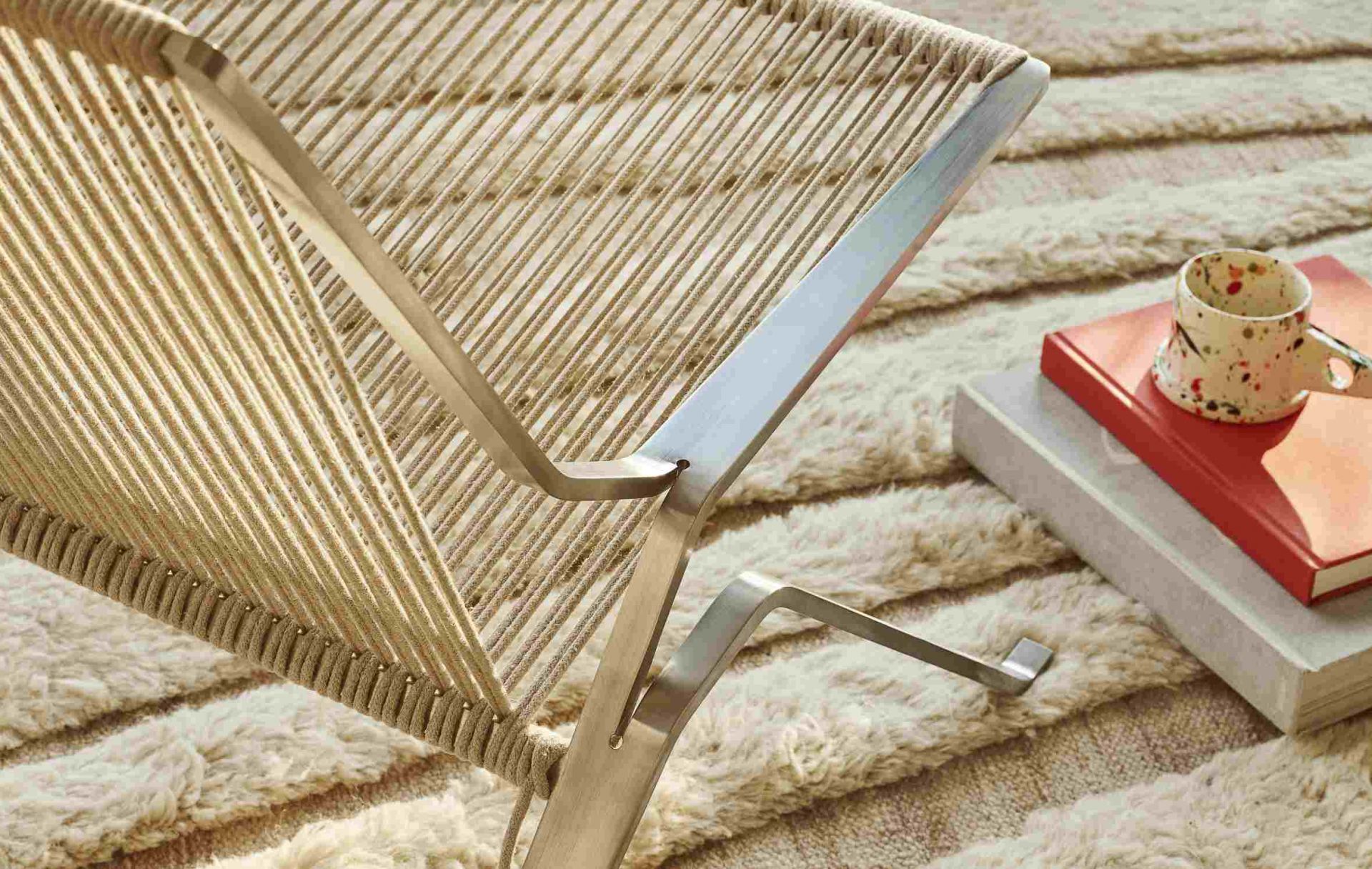 Poul Kjærholm war bemüht, die einzelnen Werkstoffe des Sessels aus einem Stück zu verarbeiten, was dem Designer-Sitzmöbel seine typische Note verleiht: Der komplexe, zusammenhängende Rahmen ist aus einem einzigen Stück Stahl ohne Nahtstellen und Verbindungen geformt. Ein langes Fahnenseil, das um die Sitzfläche und die Rückenlehne des gebogenen Stahlrahmens gewickelt ist, betont die Einfachheit des Loungesessels.