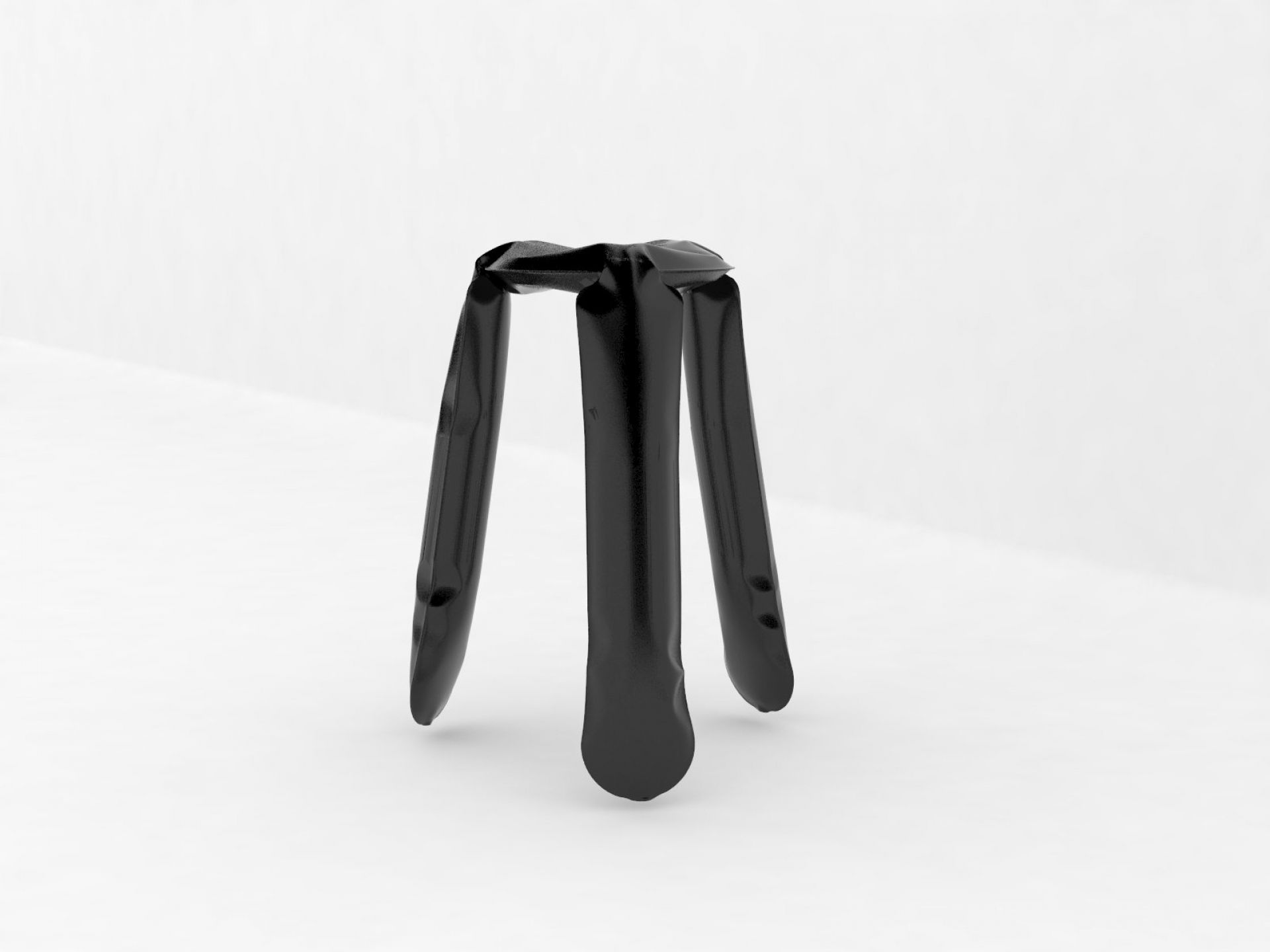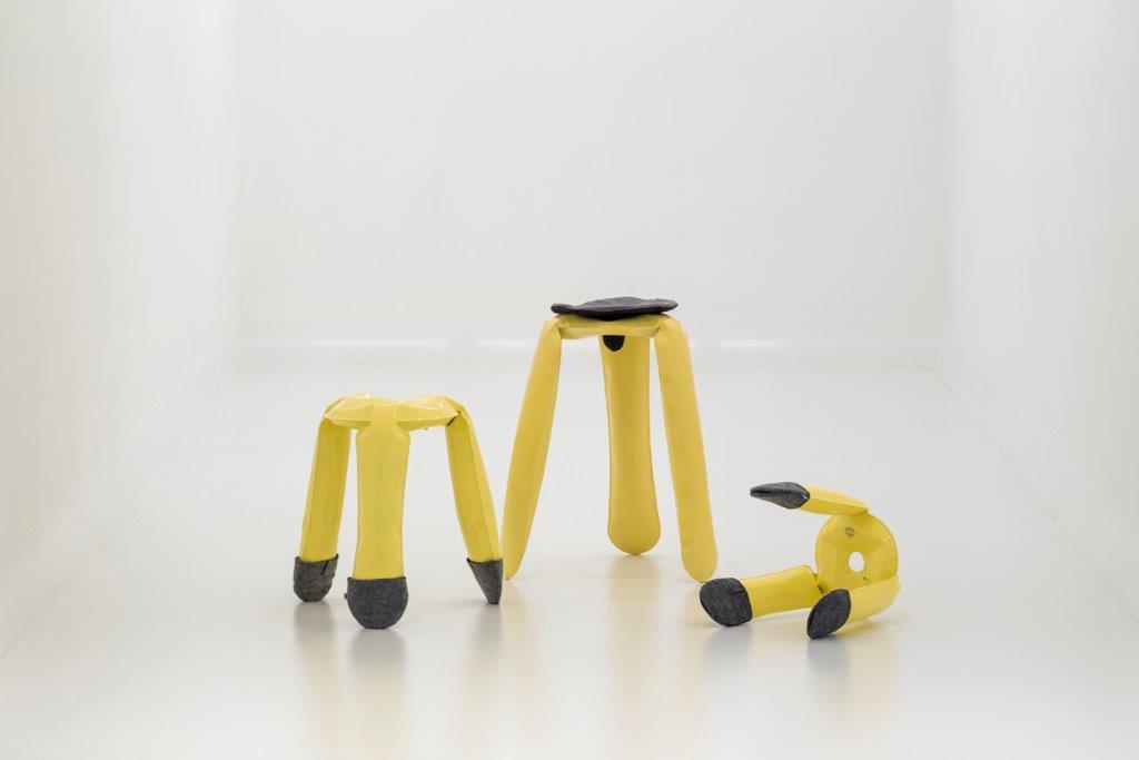 Alle Hocker der '"Plopp"- Familie' sind in dem neuartigen FiDU-Verfahren hergestellt, in welchem zwei hauchdünne Stahlbleche an ihren Kanten zusammengeschweißt und dann mit Hochdruck aufgeblasen werden, so dass eine drei-dimensionale Form entsteht.