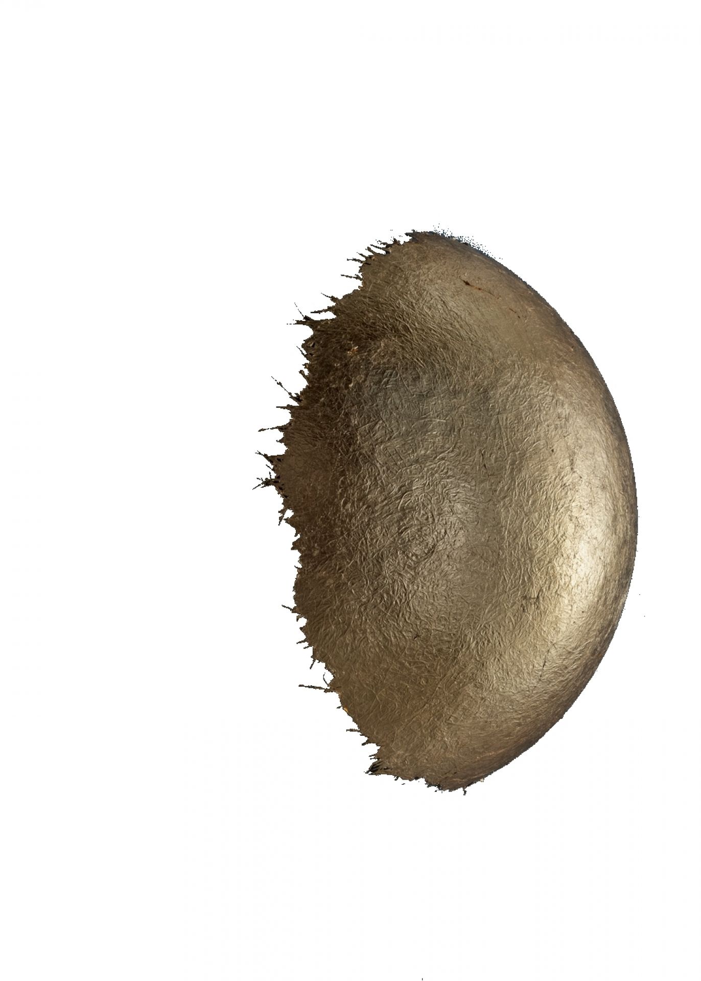 Die Leuchte ist aus einer Metallstruktur und einer goldfarbenen Fiberglasschale gefertigt. Sie hat einen Durchmesser von 70 cm.