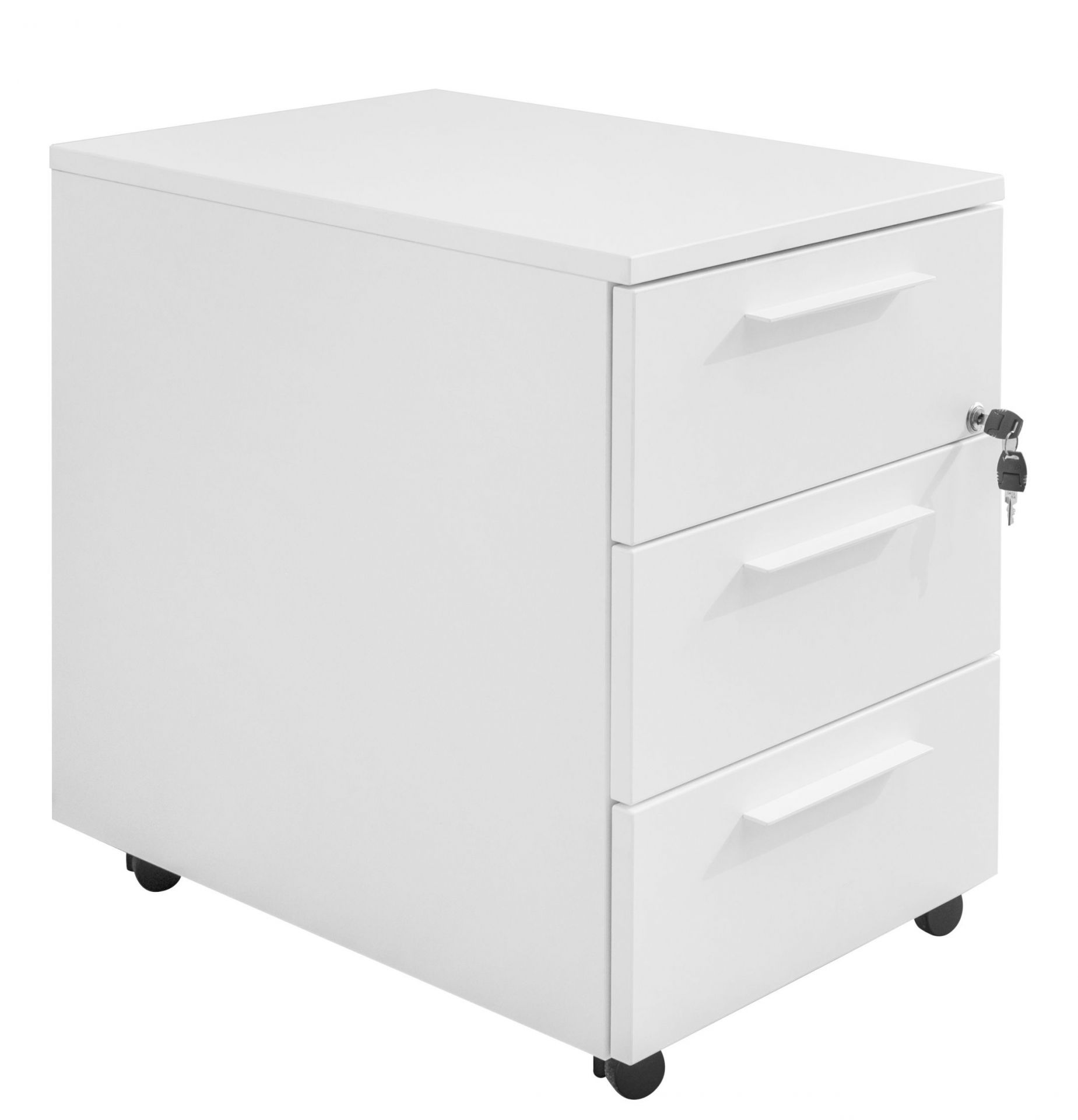 Der Rollcontainer besteht aus Metall und Melamin. Er verfügt über 3 Schubladen.