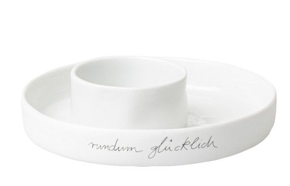 Der besondere Clou dieser Schale ist der charmante Schriftzug "Rundum Glücklich", der die Seite ziert und eine positive, fröhliche Atmosphäre verbreitet. Das stilvolle Design aus hochwertigem Porzellan verleiht der Schale eine zeitlose Eleganz, die zu jeder Einrichtung passt.