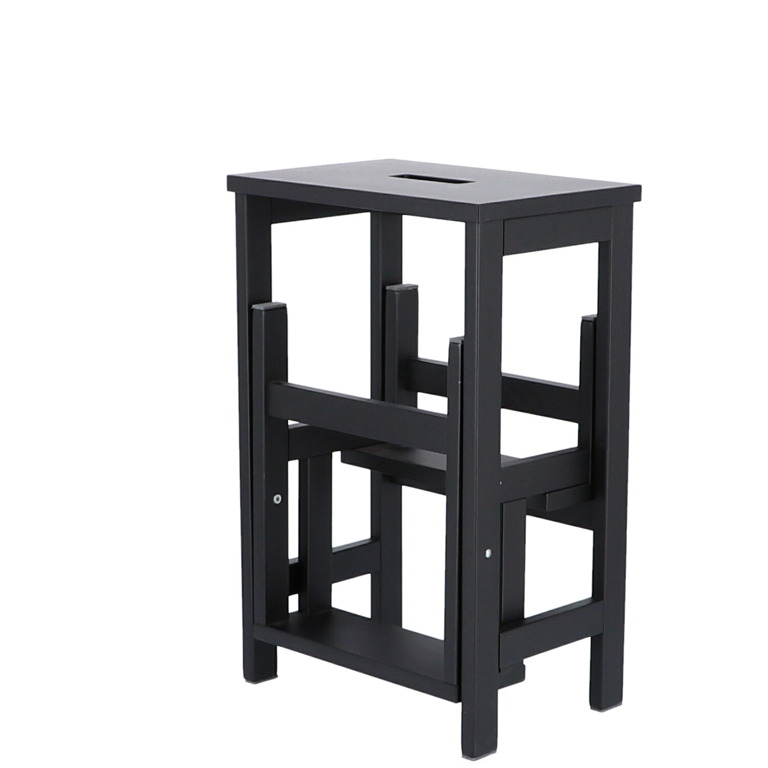 Die Hockerleiter besteht aus massivem Buchenholz, das lackiert wird. Sie ist 39 cm breit, 48 bzw. 27 cm tief (ausklappbarer Tritt) und 60 cm hoch.