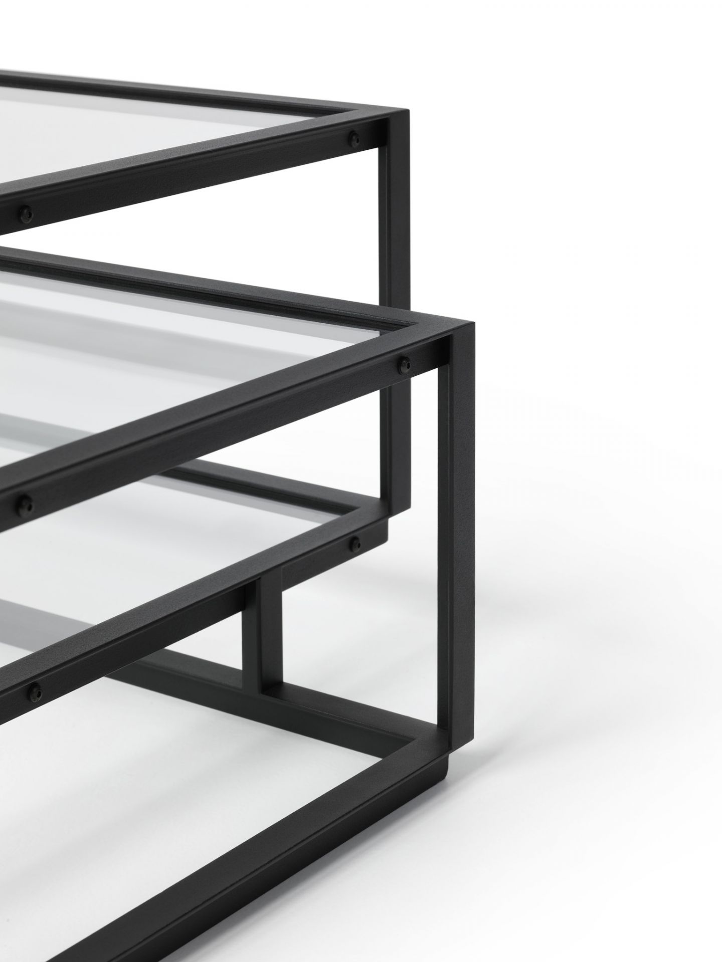 Der Tisch besteht aus Klarglas. Der Rahmen ist aus Metall, dass schwarz pulverbeschichtet wurde (RAL 9005). Der Tisch ist auch in anderen Ausführungen als der hier gezeigten erhältlich. Sprechen Sie uns dazu gerne jederzeit an!