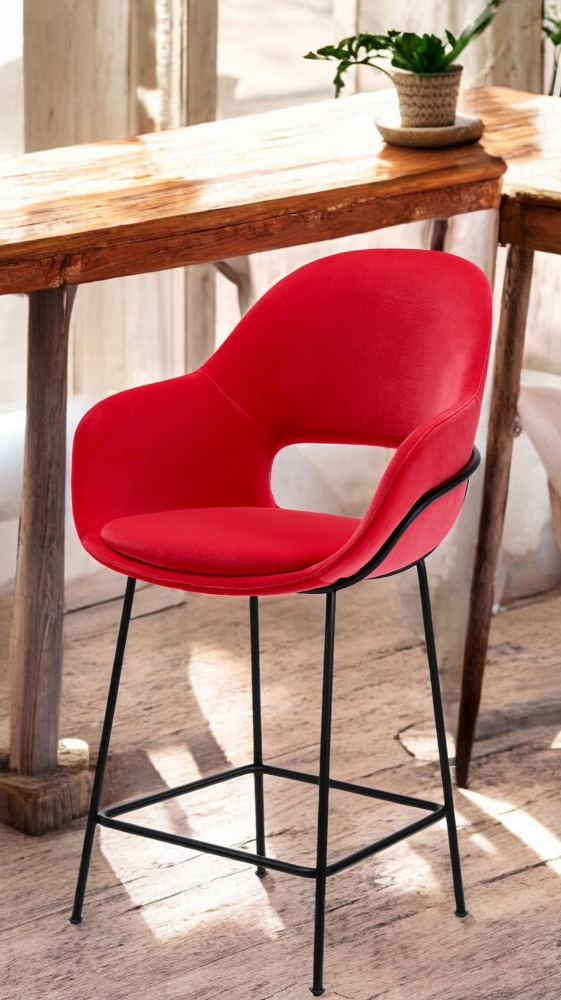 Der Theia Kitchen Armchair Barstool High Barhocker ist 63 cm breit, 59 cm tief und ist 105 cm hoch. Die Sitzhöhe beträgt 65 cm. Das in vielen Farben erhältliche hochwertige Polster thront auf einem filigranen Stahlgestell.