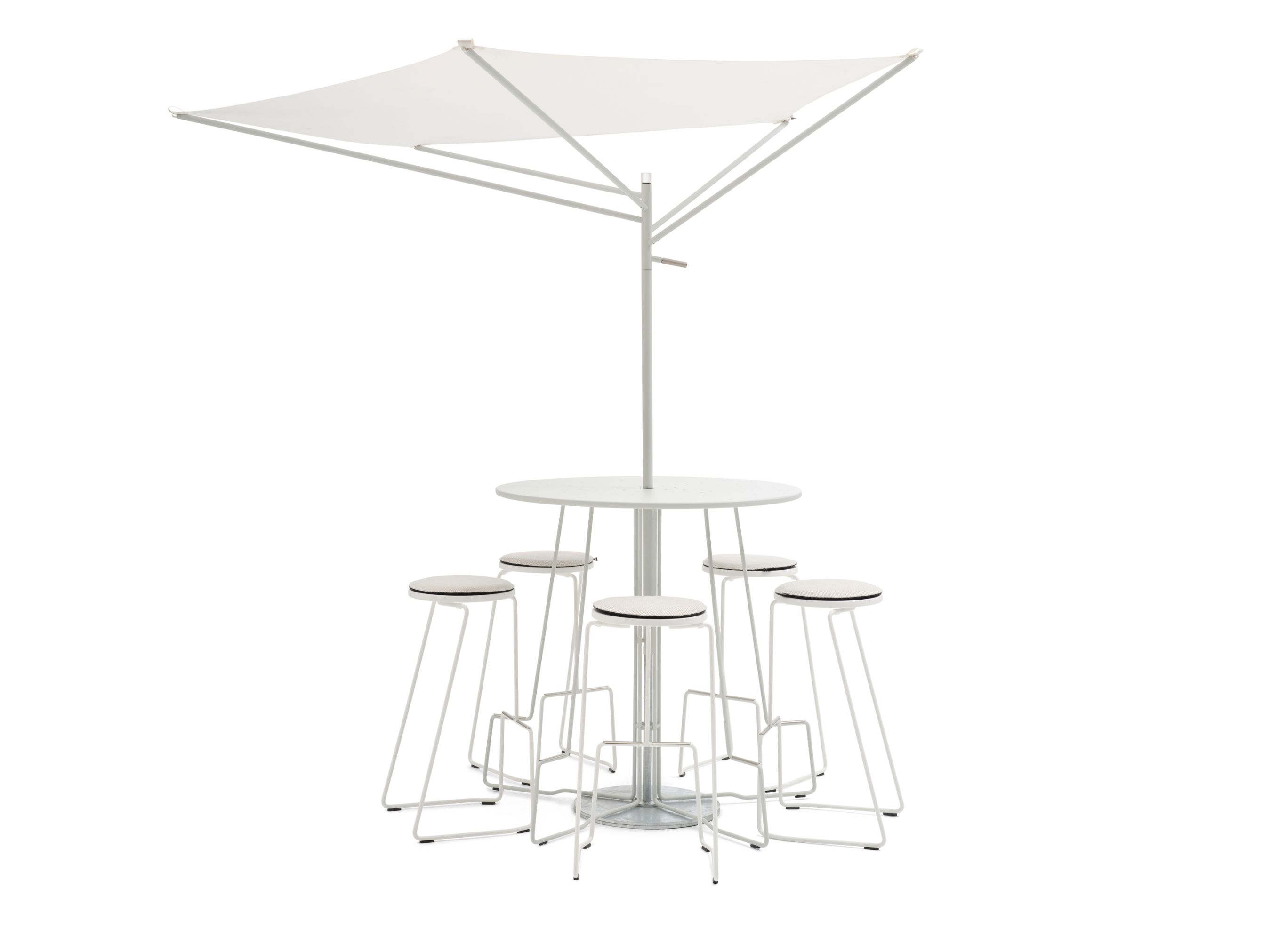 Die Tischplatte und das Gestell sind aus pulverbeschichtetem Stahl. Optional ist die Tischplatte mit einer zusätzlichen Sonnenschirmöffnung oder Drainageöffnungen erhältlich.