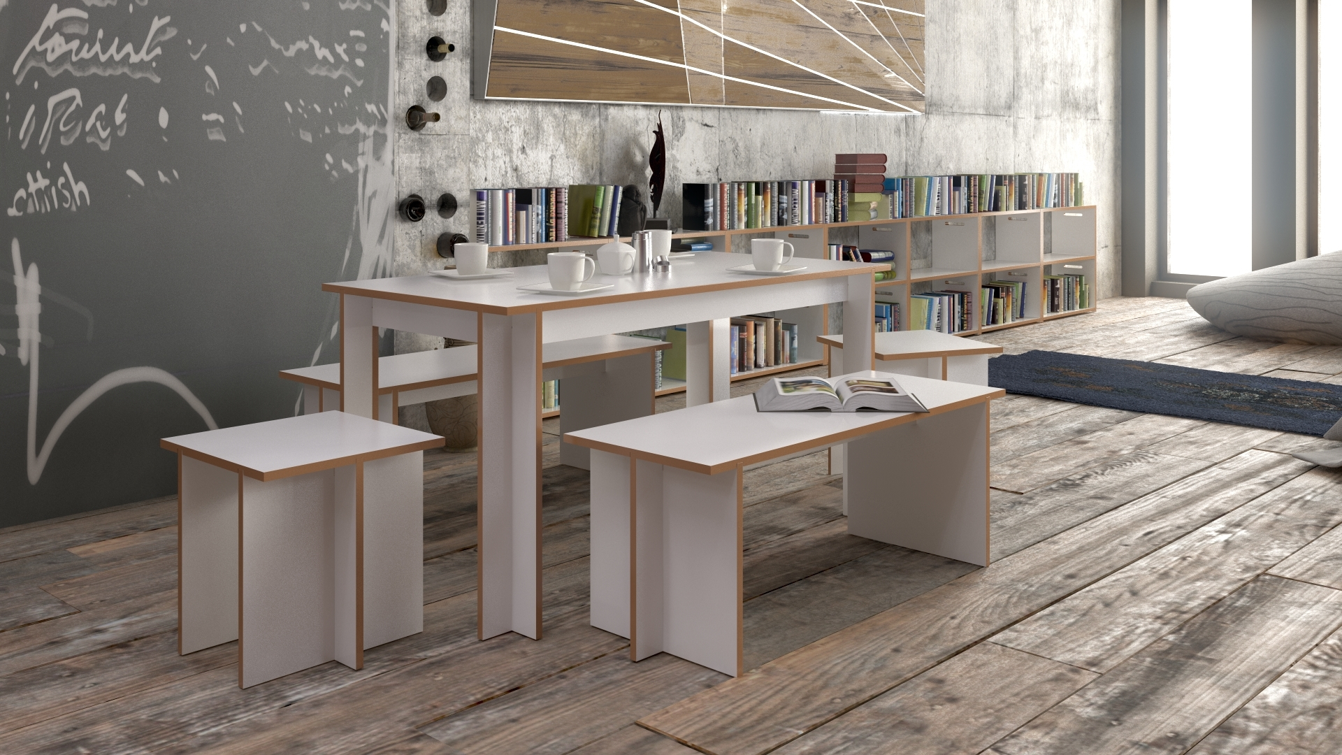 Der Tisch besteht aus weiß beschichtetem MDF. Er ist 150 cm breit, 75 cm tief und 75 cm hoch.