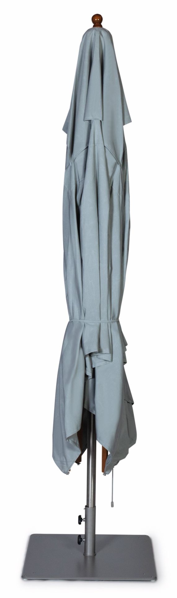 Der Trendsonnenschirm besitzt ein Gestell aus Teakholz, so wie ein Schirmstamm aus Edelstahl und eine Bespannung aus Acryltuch.