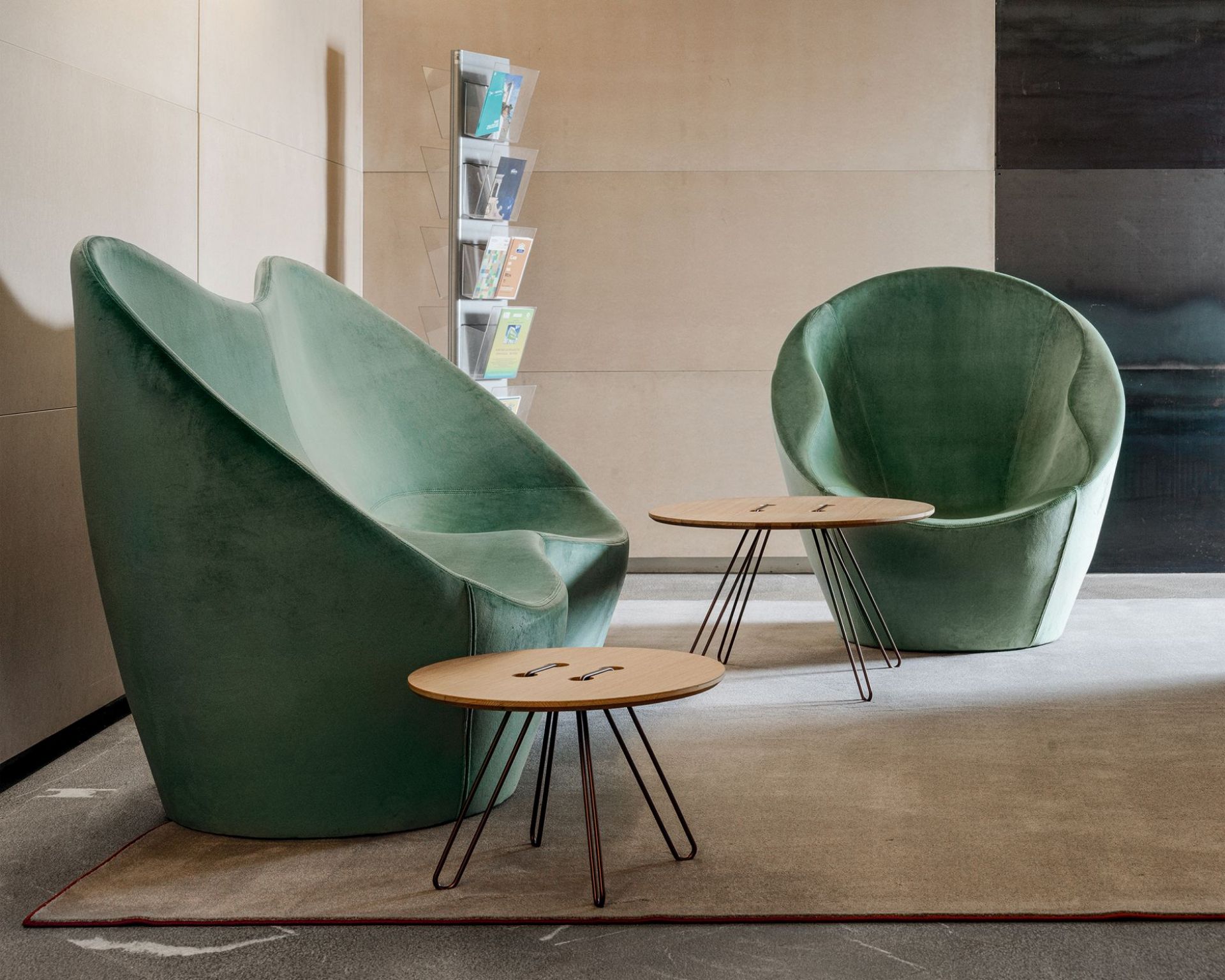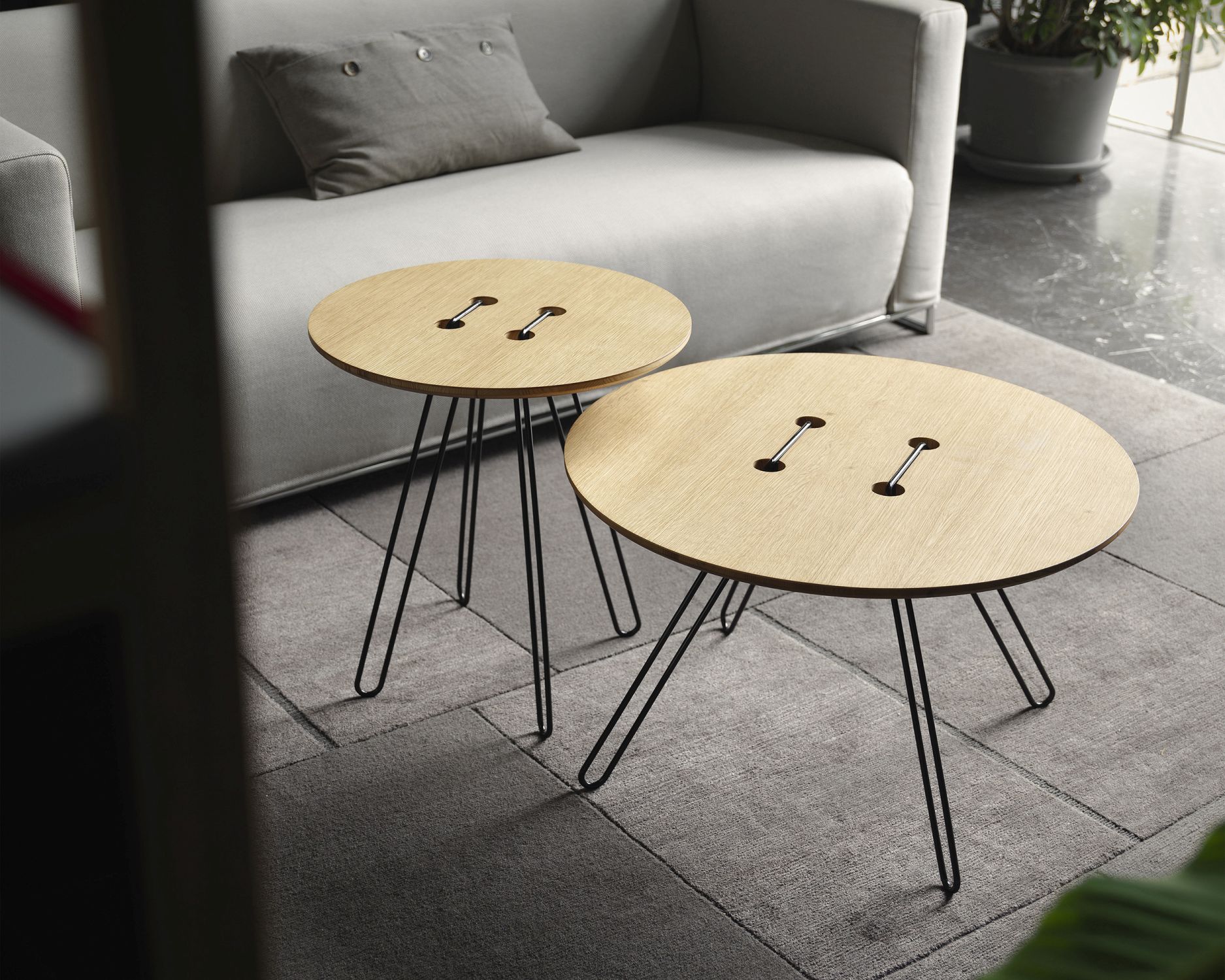 Von Knöpfen inspiriert kreierten die Designer einen runden Tisch, dessen Gestell wie bei einem angenähten Knopf mit der Tischplatte verbunden ist.