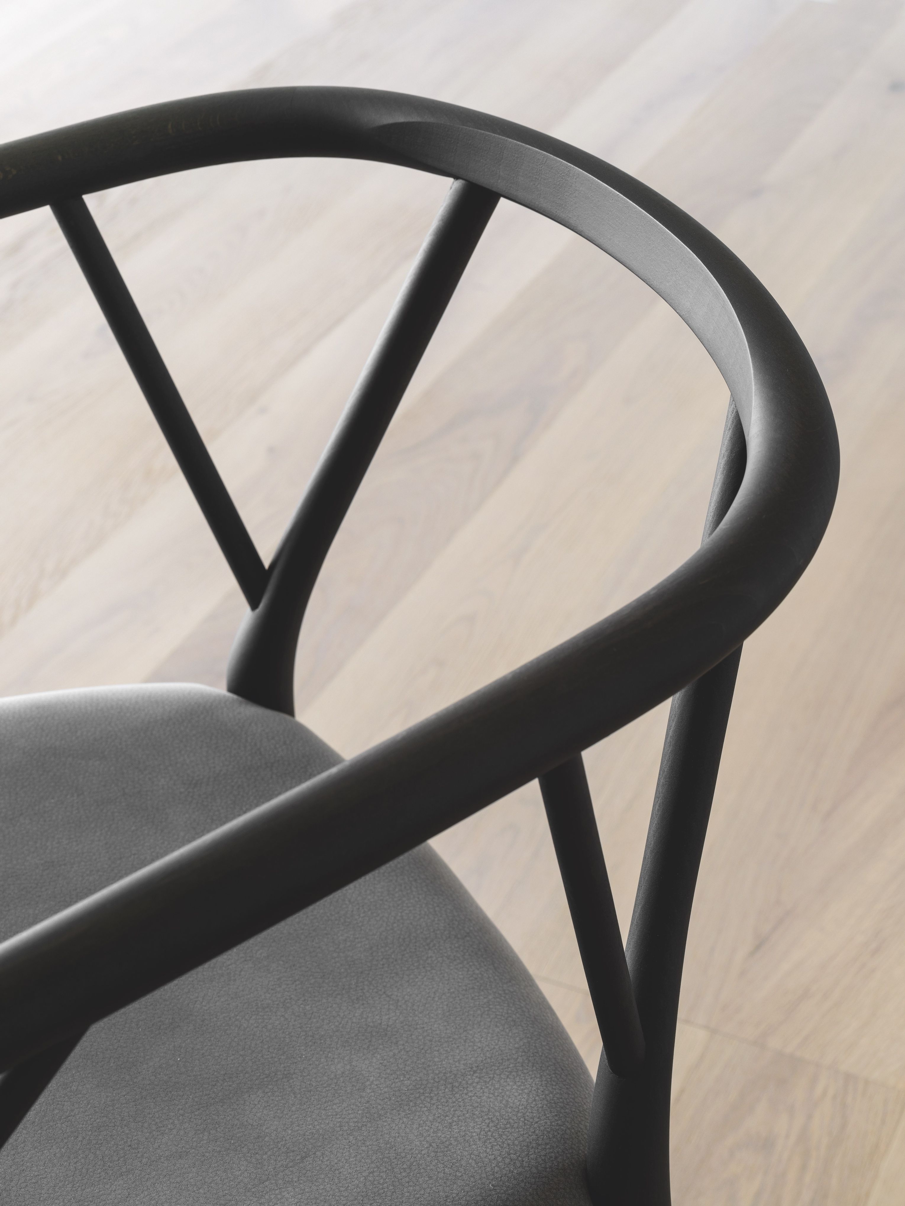 2 Stühle mit Armlehnen und kurviger Sitzfläche aus Eichenholz. Auf Anfrage auch mit Sitzflächen aus verschiedenen Stoffen verfügbar.