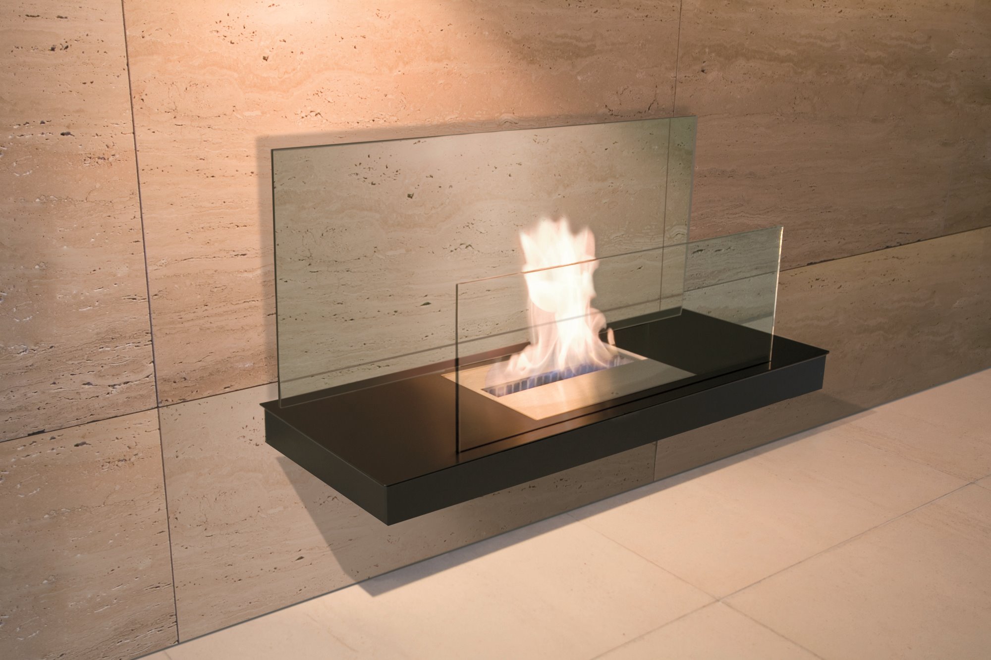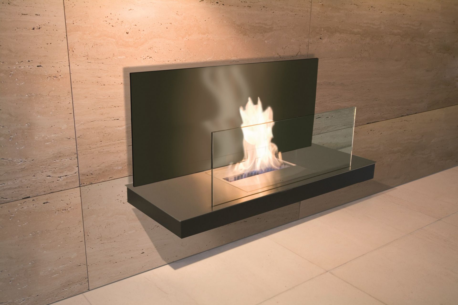 Zwei unterschiedlich hohe Glasplatten schirmen die Flammen nach vorne und zur Wand hin ab, sodass Sie keinerlei Rußflecken zu befürchten haben. Das warme Licht sorgt für eine angenehme Atmosphäre und noch mehr Gemütlichkeit in den eigenen vier Wänden.