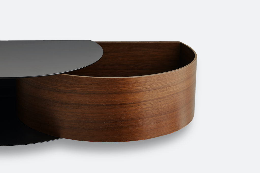 Sie fragen sich, wie die Wandschublade Woud funktioniert, fehlen doch Schubladenscharniere? Ganz einfach, Woud hat die Nussbaumholzschublade mit einem Magneten versehen, der diese an der Metallhalterung fixiert. Daher können Sie Wallie auch in jede erdenkliche Richtung öffnen und einfach herausziehen.
