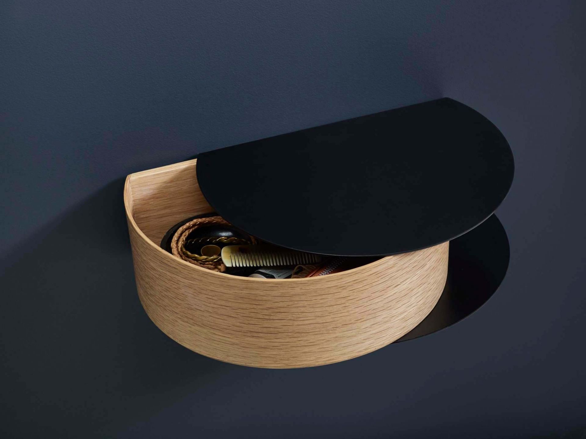 Sie fragen sich, wie die Wandschublade Woud funktioniert, fehlen doch Schubladenscharniere? Ganz einfach, Woud hat die Eichenholzschublade mit einem Magneten versehen, der diese an der Metallhalterung fixiert. Daher können Sie Wallie auch in jede erdenkliche Richtung öffnen und einfach herausziehen.