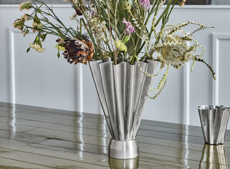 Besonders Liebhabern von Industrial- und Skulptural-Design macht die HDFlood Vase schmal von House Doctor eine große Freude: ihre handgearbeitete, gebürstete Metalloberfläche und der markante Faltenwurf setzen allein oder mit wenigen Zweigen ein kraftvolles, modernes Statement.